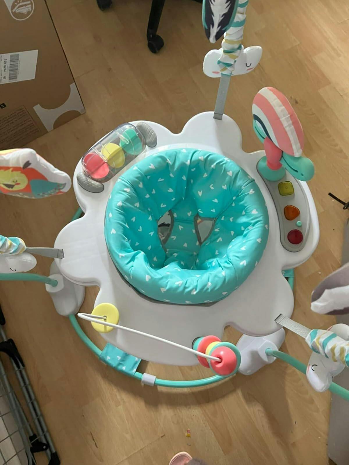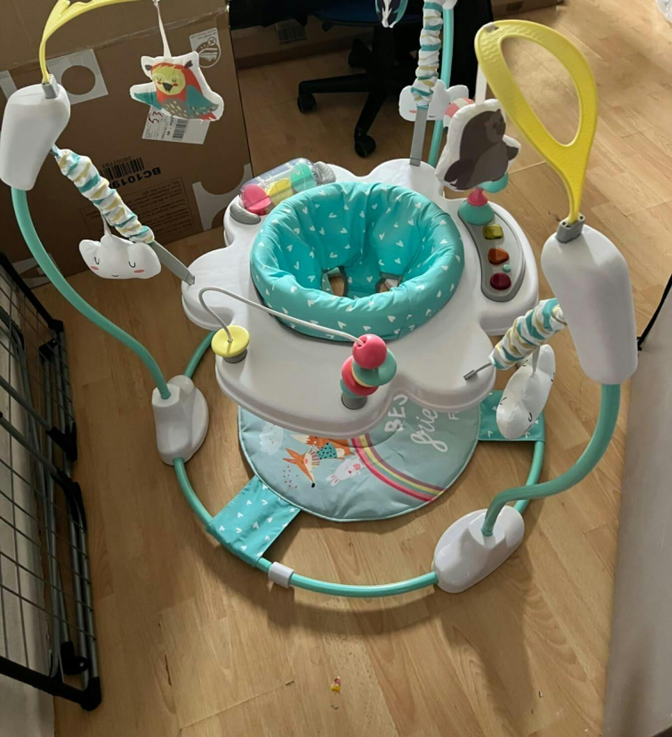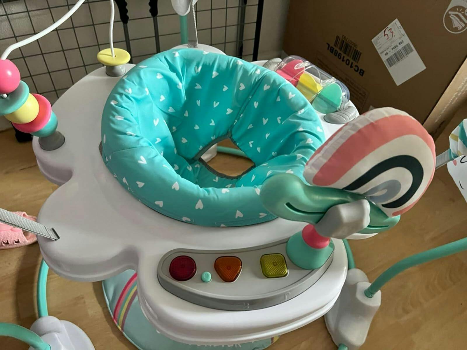 • ✔INTERACTIVE TOYS & MUSIC BOX- This baby jumper comes with 10 pcs engaging and interactive activities: a roller, an owl, a bear, a seesaw, 3 cloud-shaped toys, a beads game, a hedgehog, a music tray with lights and sound effect, a foot pad that makes a rustling sound. These toys can stimulate your baby's senses and promote cognitive development. Note: music tray requires 3 AAA batteries (not included).