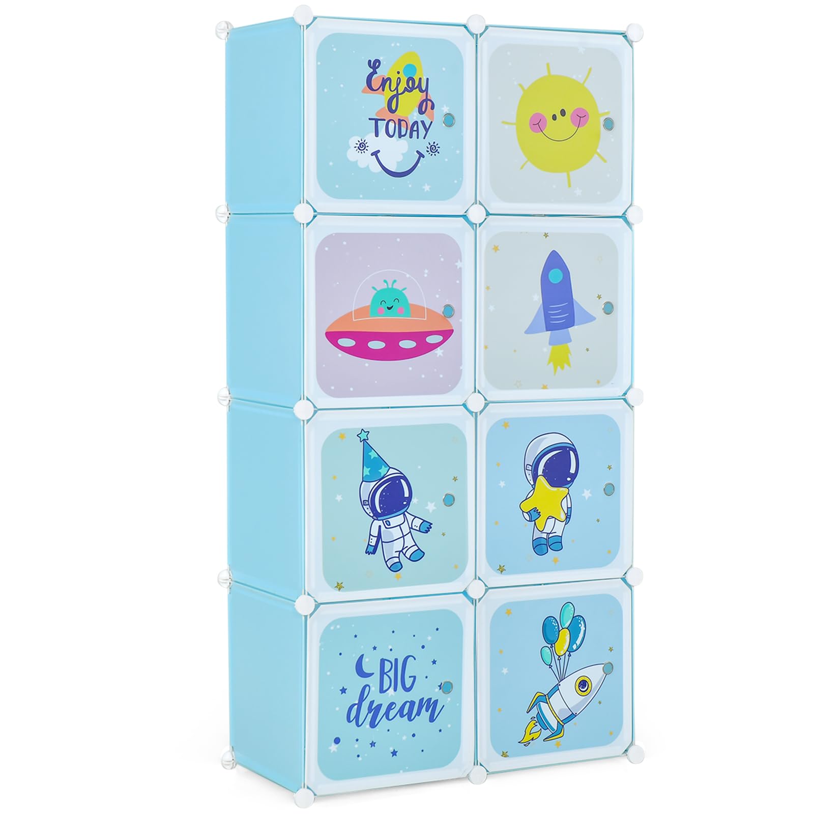GYMAX Cartoon Clothes Closet, Portable Kids Wardrobe with Hanging Section( 8 Cubes Space: 74 x 36 x 144cm)