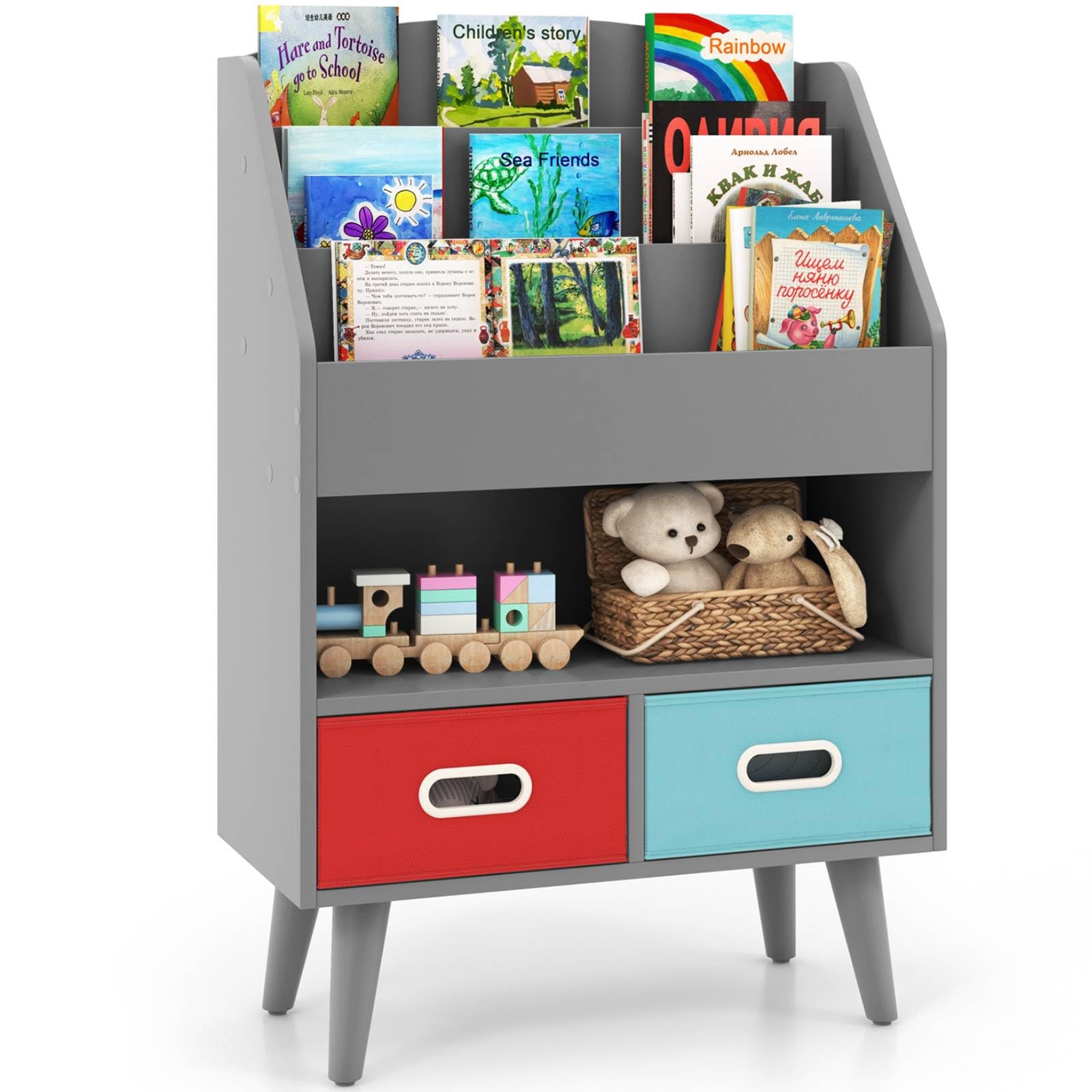 • This children bookcase boasts a strategic layout with a 3-tier shelf, a sizeable middle compartment, and 2 foldable fabric drawers.