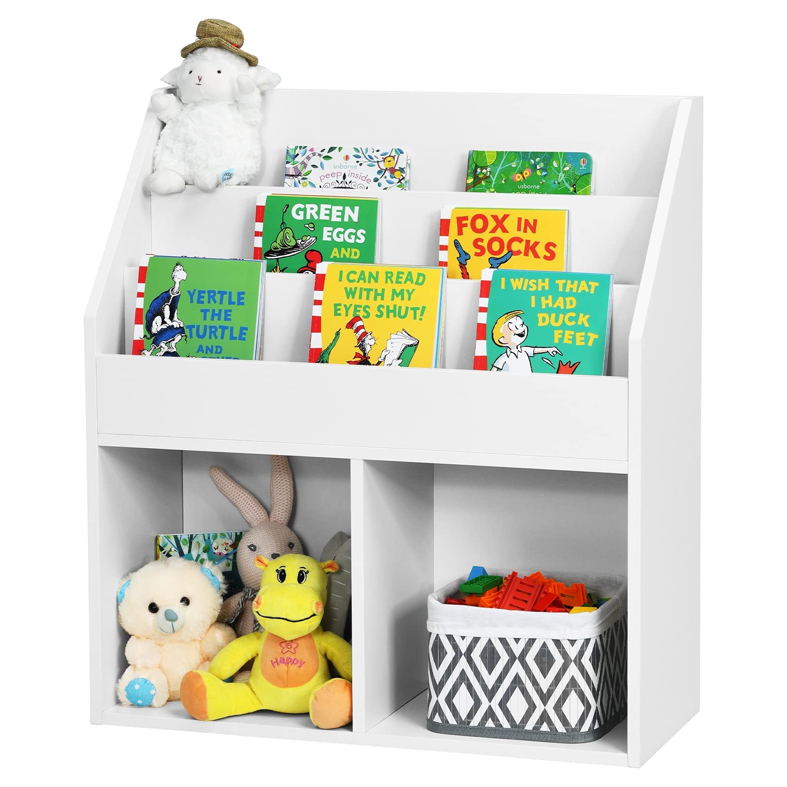 GYMAX Wooden Kids Bookshelf with 3 Tiers Shelves and 2 Compartments