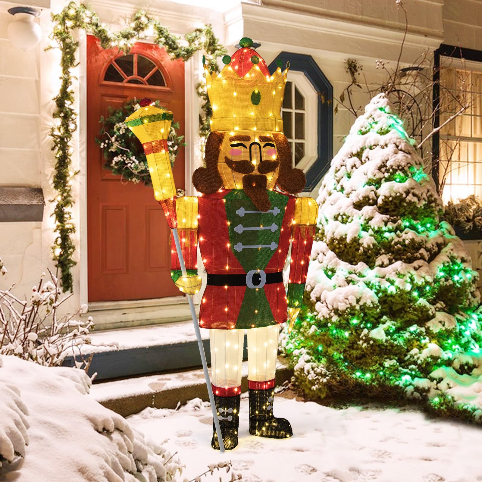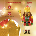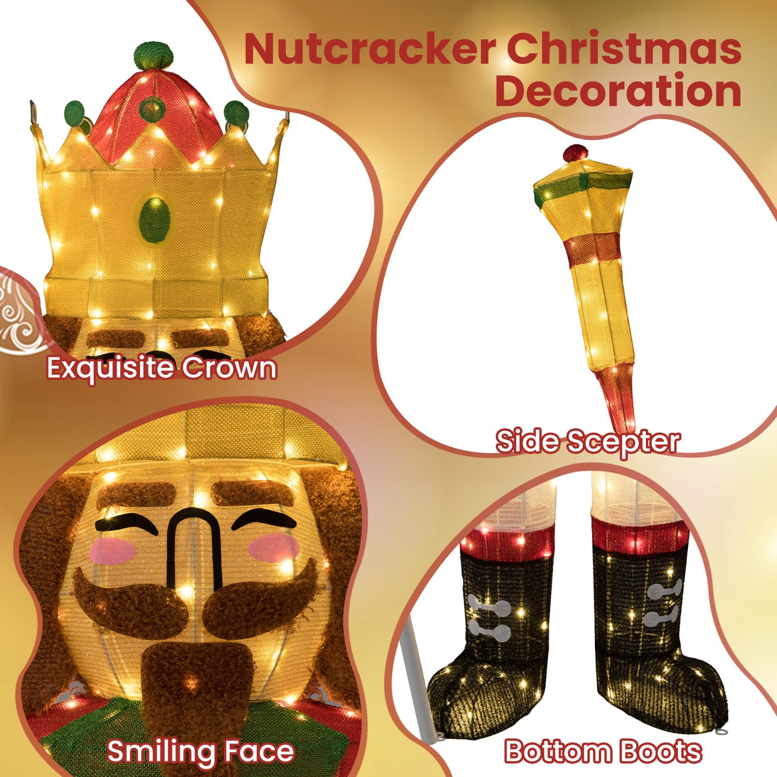 Crafted with 236 warm white LED lights, this pre-lit nutcracker adds a festive glow to your yard, porch, or home. With a majestic crown and scepter, its cheerful appearance brings joyful charm to any Christmas display. Built from quality, long-lasting materials, the nutcracker decoration will accompany you for years to come. Additionally, the ground stakes and zip ties are included for quick and stable installation, keeping your nutcracker upright and secure. Our Christmas decoration is sure to catch everyone’s eye, becoming a standout centerpiece for your seasonal celebrations.