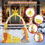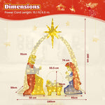 Brighten your holiday with our elegant lighted nativity, showcasing Mary, Joseph, and Baby Jesus beneath a glowing star. With 240 warm white LEDs, it gives off a peaceful glow that welcomes friends and family. Water-resistant fabric pairs with 10 butterfly screws, 34 ties, and 15 ground stakes ensure lasting outdoor stability. Thanks to the plug-in design, extra-long cord, and separate sections, you can arrange it however you like. Sturdy and charming, this nativity scene is a classic display for every Christmas season!