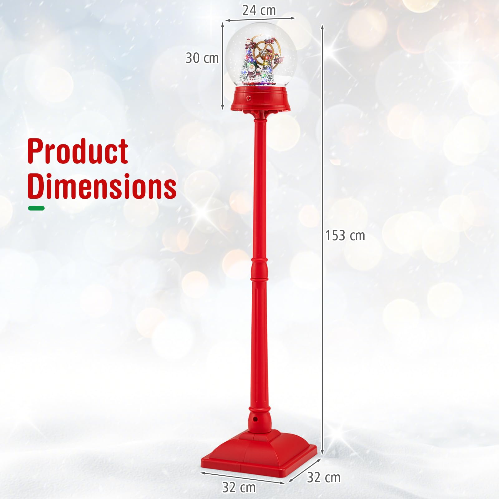 At its heart, a Ferris wheel whirls behind Santa and a snowman, all surrounded by swirling snow and the glow from colorful LED lights. Enjoy the delightful sound of 8 classic Christmas tunes like “Jingle Bells”, or simply bask in the lamp’s festive lights by switching to silent mode for a serene holiday mood. Wire-free for flexible placement, this versatile piece can stand tall as a festive floor lamp or convert to a charming tabletop snow globe, making it easy to add holiday cheer to your living room, entryway, or even your mantel. Bring warmth and wonder to your place with our Christmas-themed indoor street lamp!