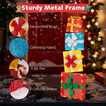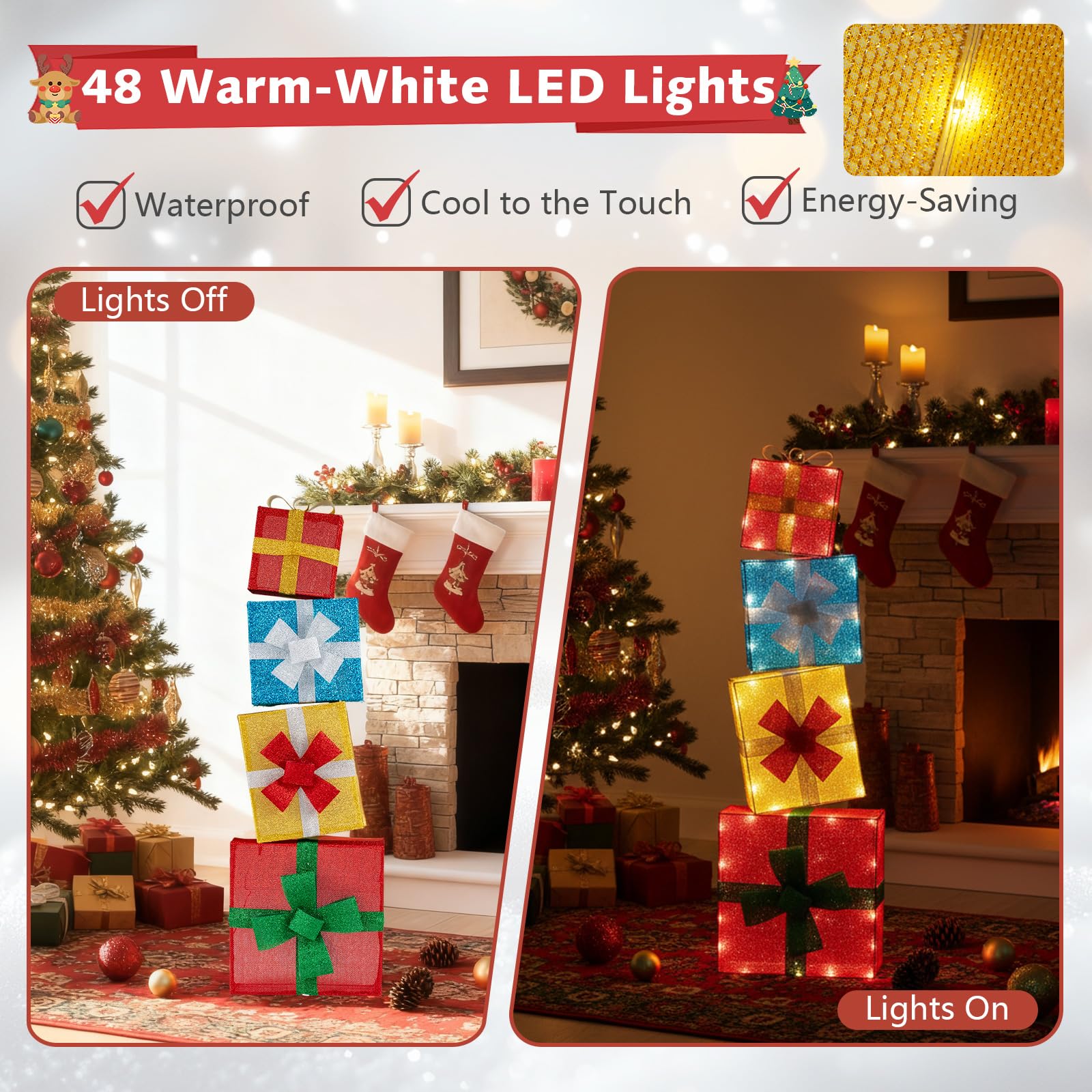 Standing 4 ft tall, this lighted decoration glows with cozy lights and bright colors, adding sparkle to your Christmas display. With 2 display methods available, you can choose to stack them on the porch or arrange them inside by the tree. Built with a sturdy metal wire frame, they are made to handle winter weather outdoors. Quick to assemble and easy to store after the holidays, these pre-lit gift boxes are a delightful accent you’ll look forward to using year after year!