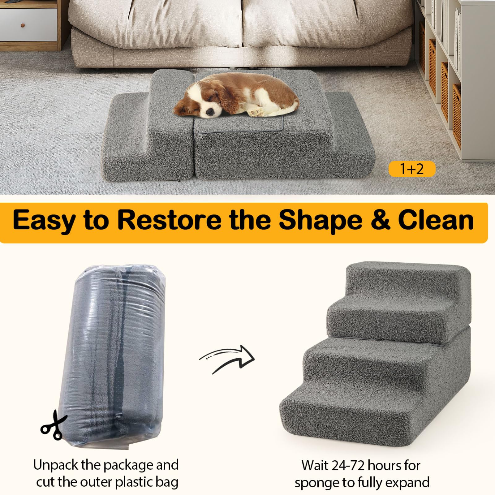 Easy Maintenance & Warm Tip: The foam pet ladder comes with a zippered cover, which is machine washable for effortless care. Note: The 4-step pet ramp is packed with vacuum compression. Please unpack the package and cut the outer plastic bag, then wait 24-72 hours for sponge to fully expand.