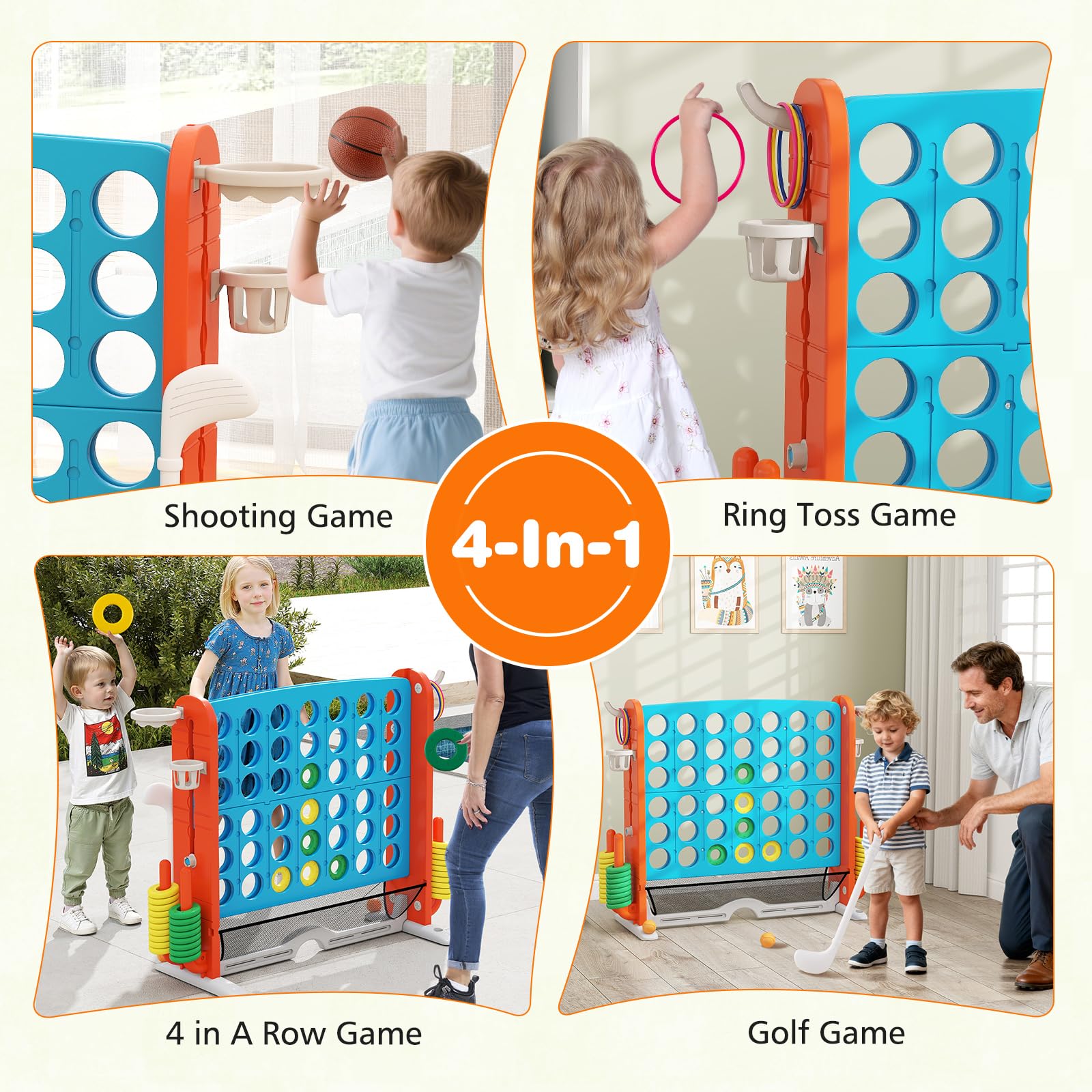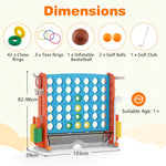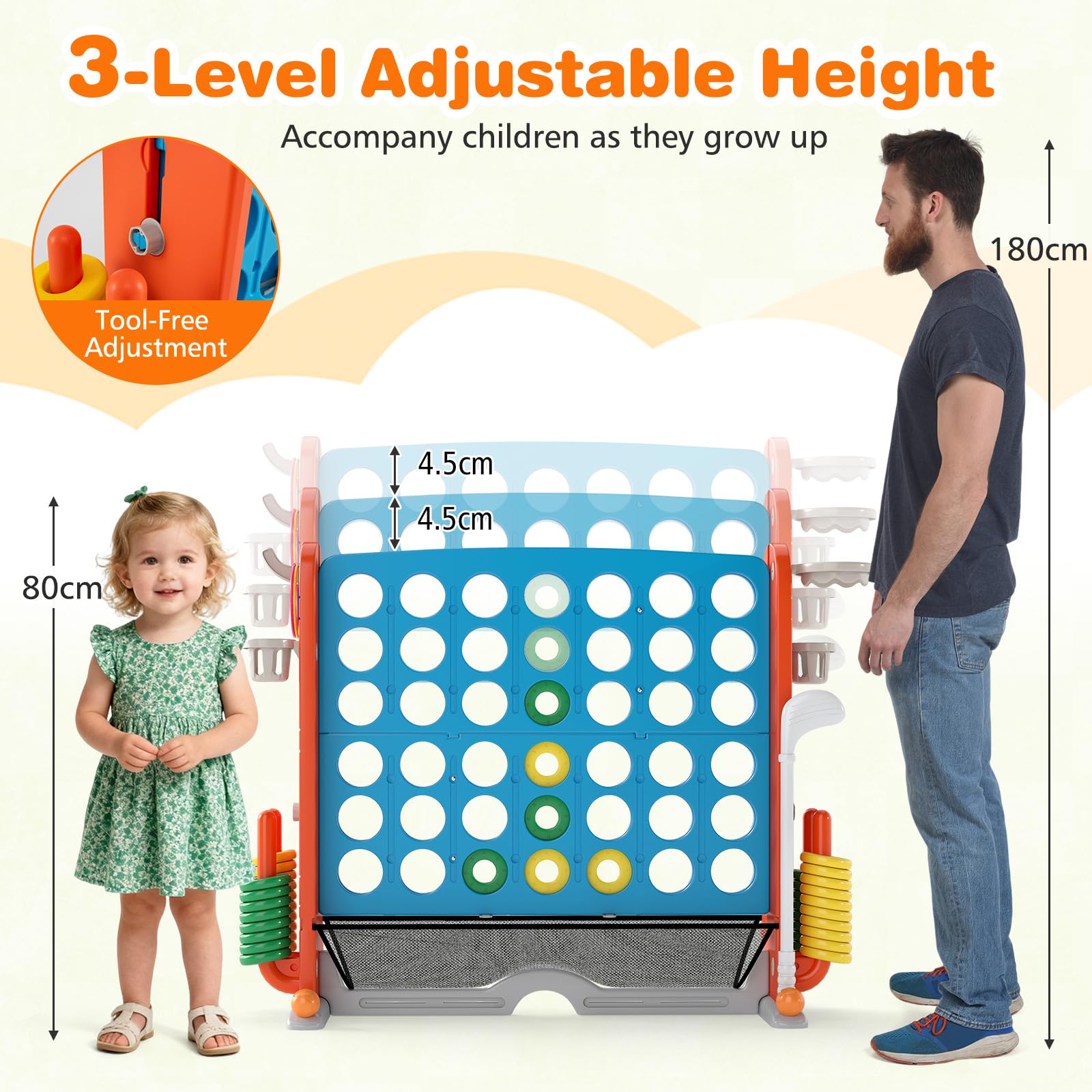 Experience endless entertainment with this versatile giant 4-in-a-row game set — the ultimate choice for family fun! Featuring classic connect 4, golf game, shooting, and ring toss, this floor game set adapts to all ages with 3 adjustable heights, making this game set perfect as a kids’ outdoor game or an indoor party essential. Thanks to a quick-play design, action never stops; the mesh collection system ensures rapid resets for back-to-back excitement. Crafted from safe, child-friendly materials and loaded with thoughtful details like cup and ring holders, this jumbo yard game is designed for convenience at every event. Bring the connect 4 game set to backyard gatherings, school carnivals, or indoor playdates—the fun goes wherever you do!