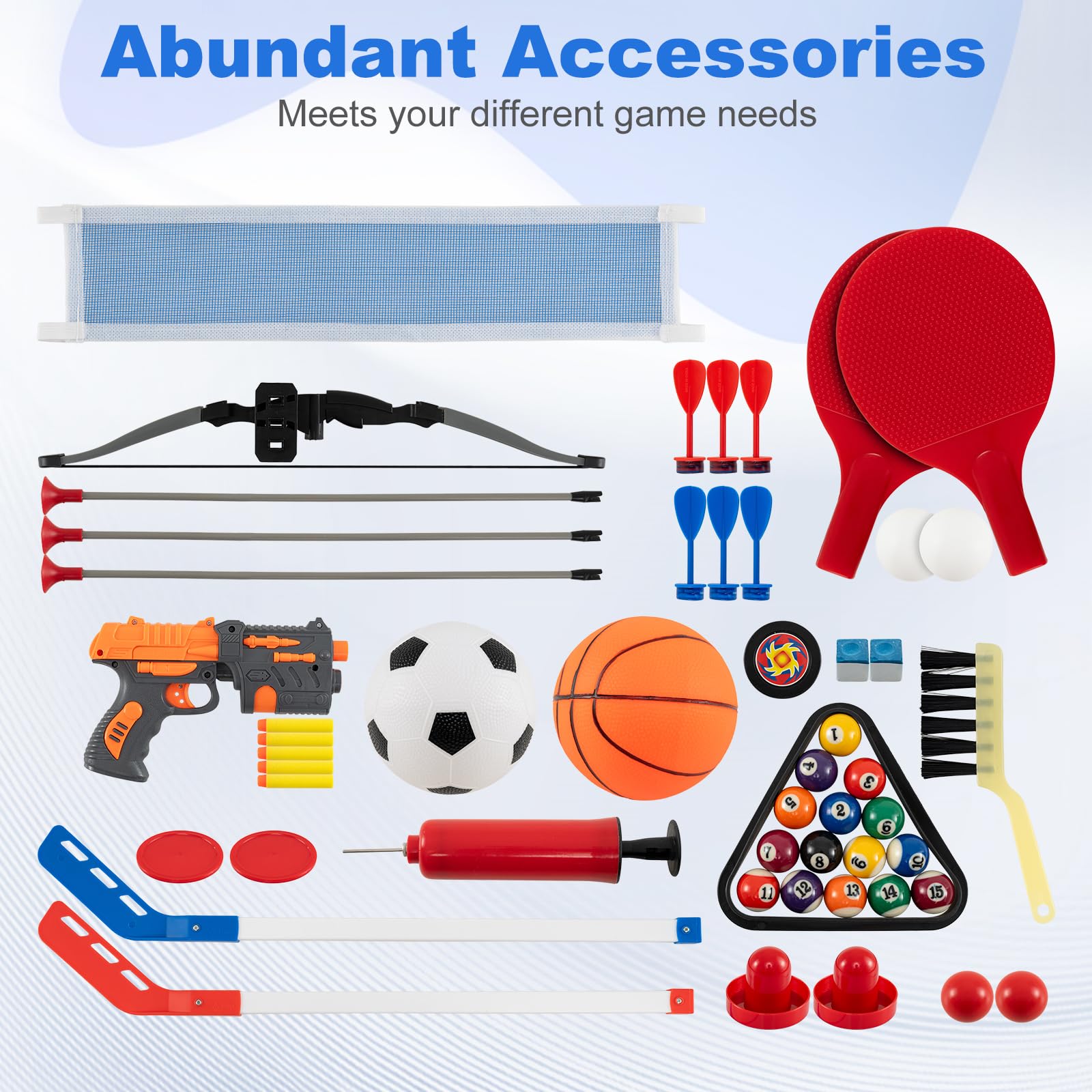 Whether you're in the mood for basketball, billiards, foosball, ping pong, hockey, shuffleboard, bowling, chess, checkers, backgammon, ring toss, horseshoes, poker or tic tac toe, this game table has got you covered! This 14-in-1 game table set with abundant accessories can be the ultimate entertainment hub for a lively party, a family night, or a casual evening with friends. The stackable game panels are designed for easy storage and space saving. What's more, crafted from high quality materials with fine workmanship, this combo game table set will give you a reliable and enjoyable gaming experience.