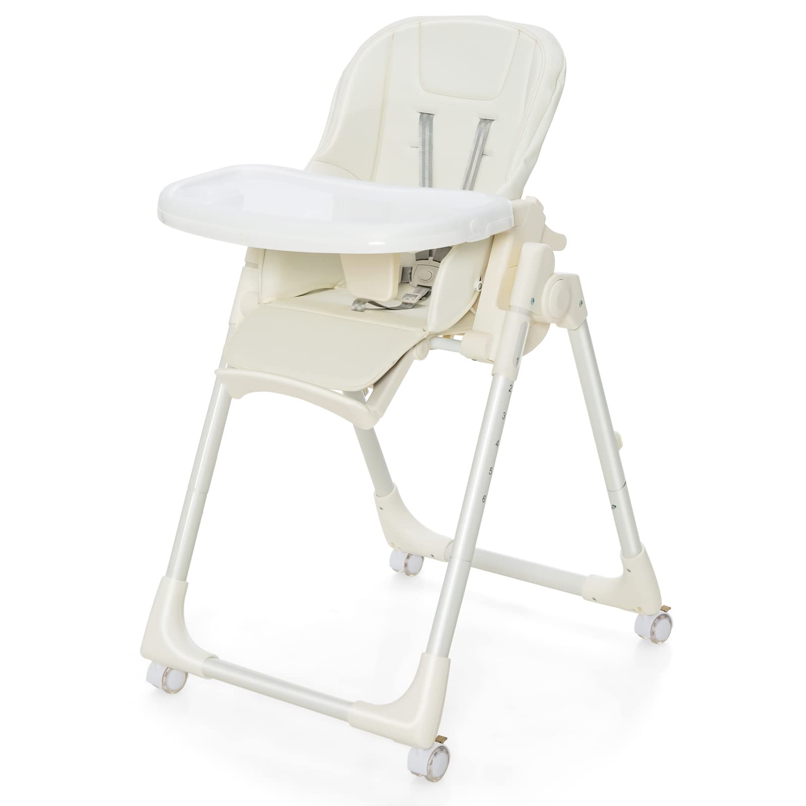 GYMAX Foldable Baby Highchair, Adjustable Toddler High Chair with Lockable Wheels (Beige)