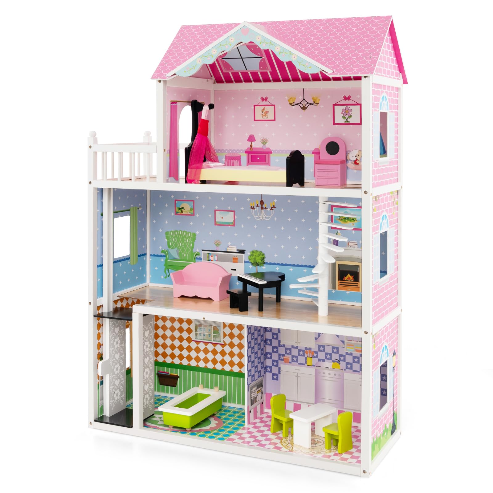 GYMAX Kids Dollhouse, 3-Storey Wooden Dolls House with 5 Simulated Rooms & Furniture Accessories
