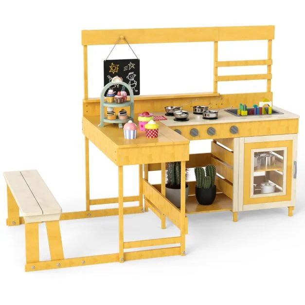 - ✔SAFETY COMES FIRST- Crafted from robust fir wood, this wooden toy kitchen ensures a stable and sturdy structure that stands up to active play. The splinter-free surface and rounded edges provide a safe touch, minimizing the risk of injuries, making this large play kitchen an ideal choice for worry-free outdoor fun.