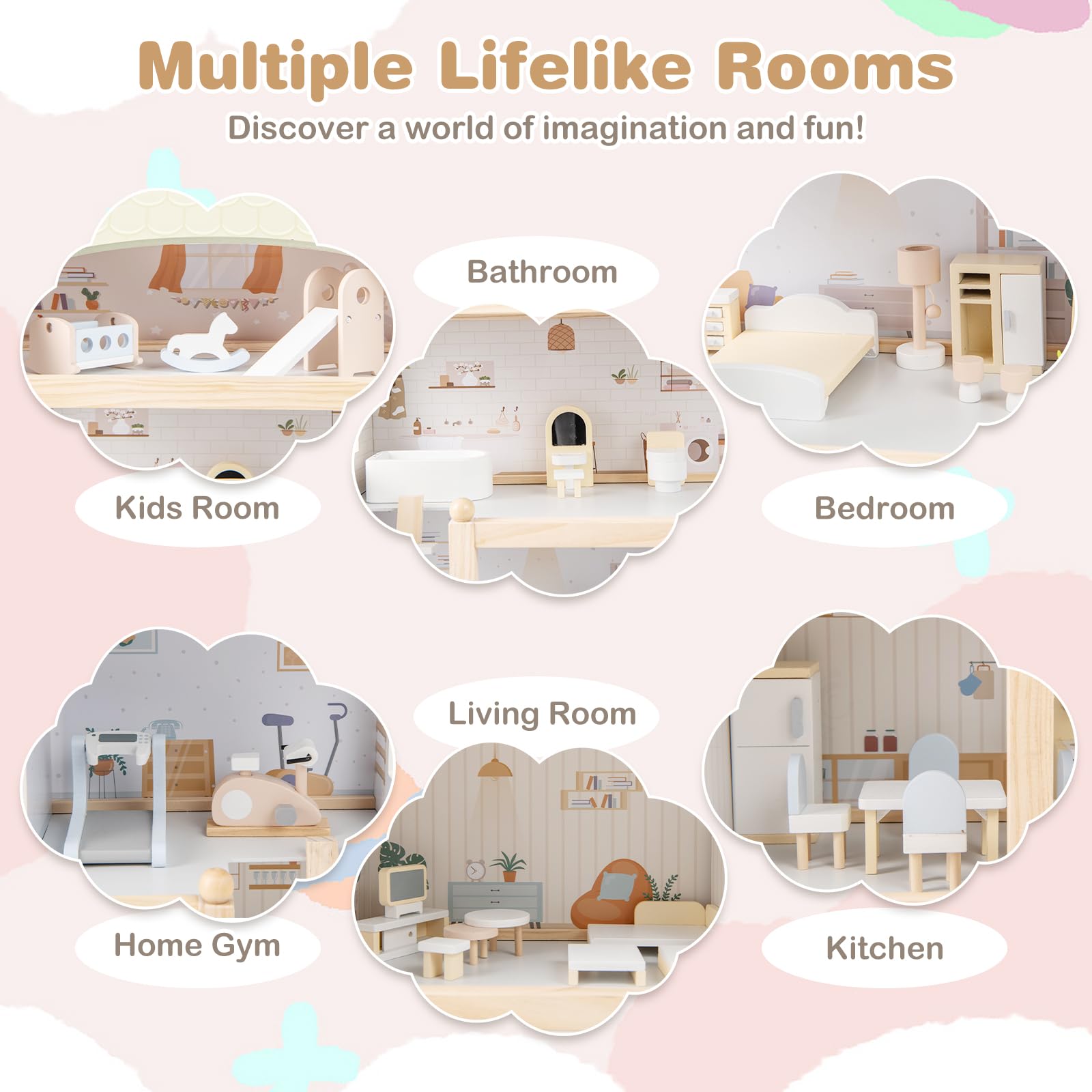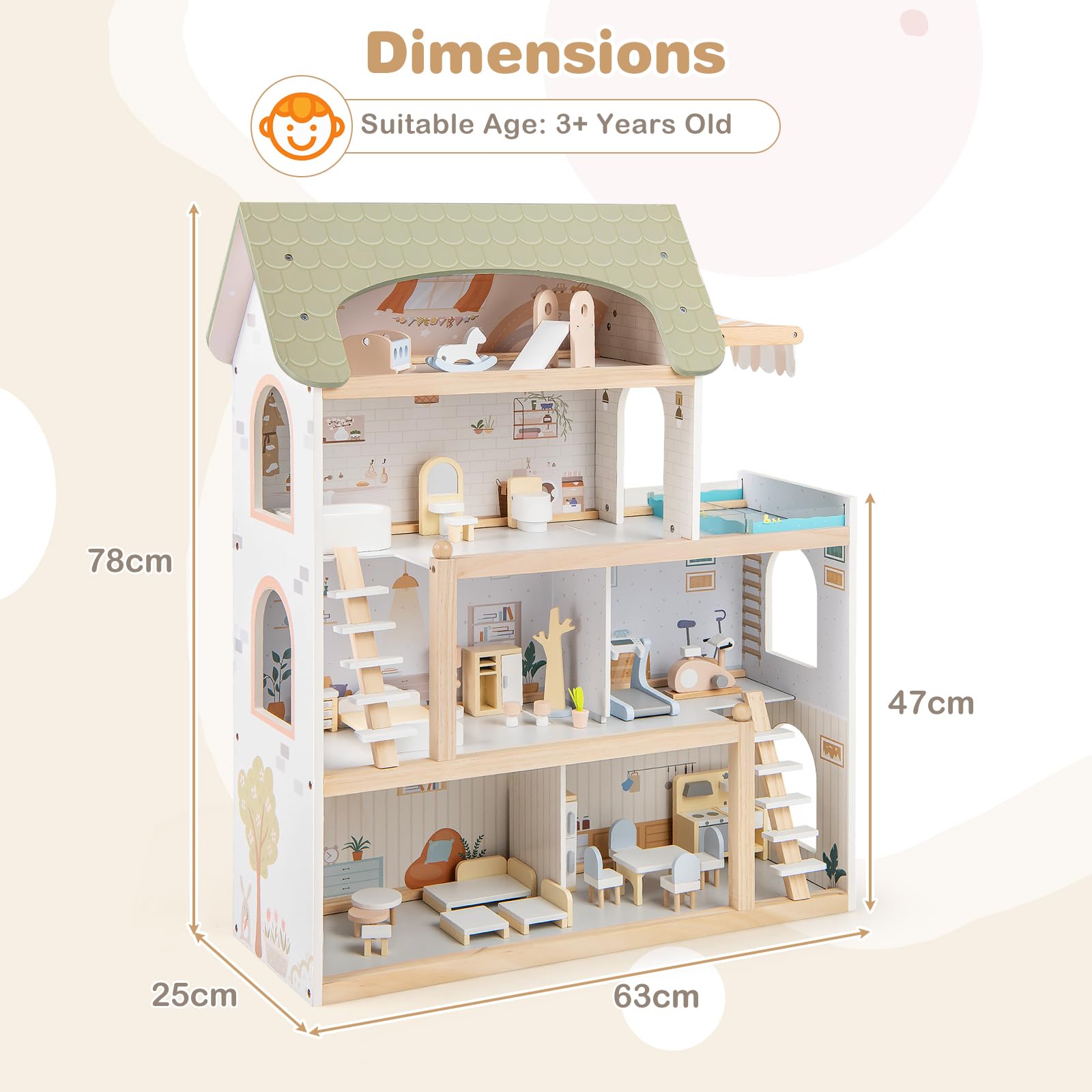 Wooden Dollhouse with 33 PCS Furniture Accessories for Girls and Boys