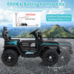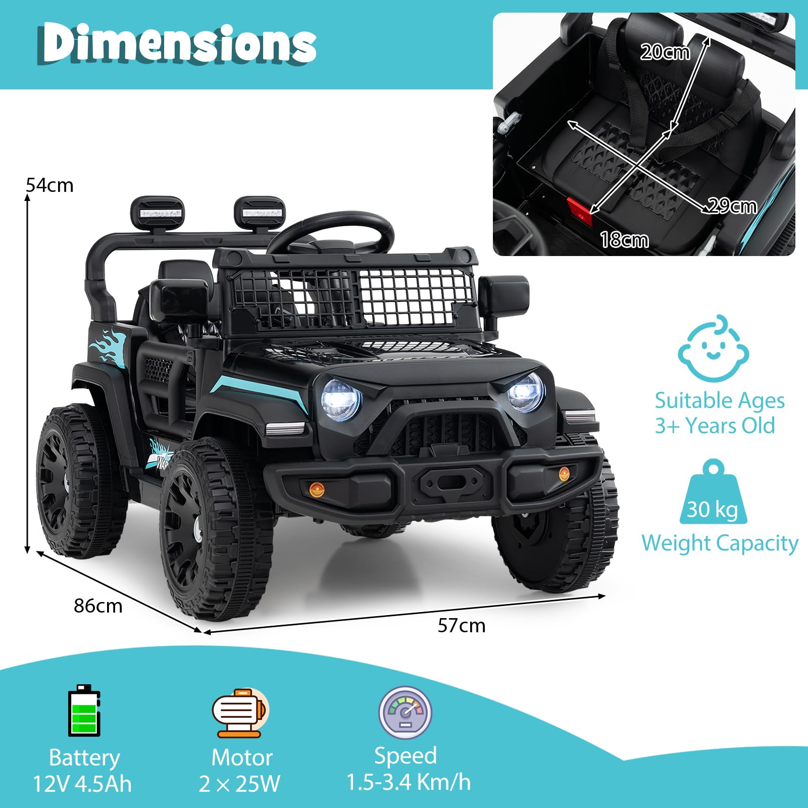 Let your child buckle up for endless fun with our 12V kids ride on truck car! This high-performance electric toy car is powered by dual 25W motors and a robust 12V battery. Parents can choose to let children steer independently using the wheel, foot pedal, and buttons, or take over with a handy remote. Each ride is smooth thanks to shock absorbers on the rear wheels, as well as soft start and stop functions. The electric vehicle prioritizes safety during children’s adventures, with lockable doors and an adjustable safety belt. To elevate the fun, this toddler ride on truck comes with bright LED headlights and a sound system including music and a horn, turning every ride into a joyous and lively journey.