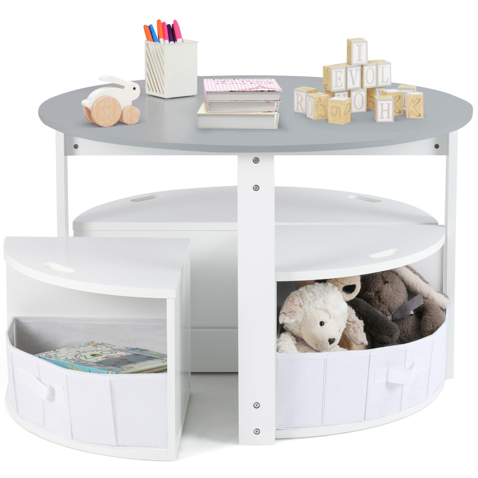 • The 5-piece kids table and chairs set is equipped with 1 round tabletop and 4 fabric drawers, encouraging children to organize all their items.
