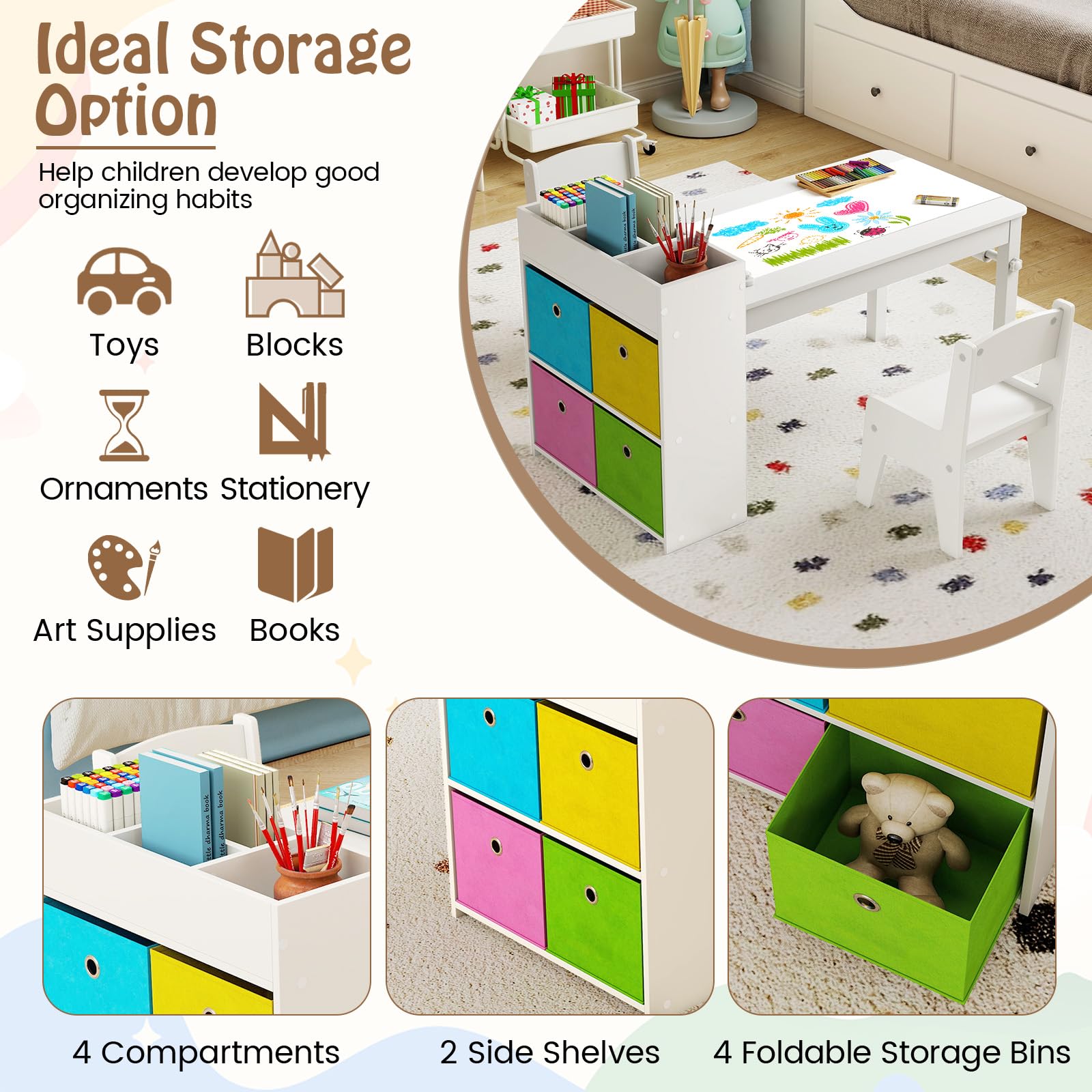 - 【Abundant Storage Space】The art desk provides roomy storage space for kids. 2 side shelves, 4 compartments, and 4 fabric storage bins enable kids to well organize different items, such as toys, books, blocks, and art supplies. They can also place their stationery on the spacious desktop.