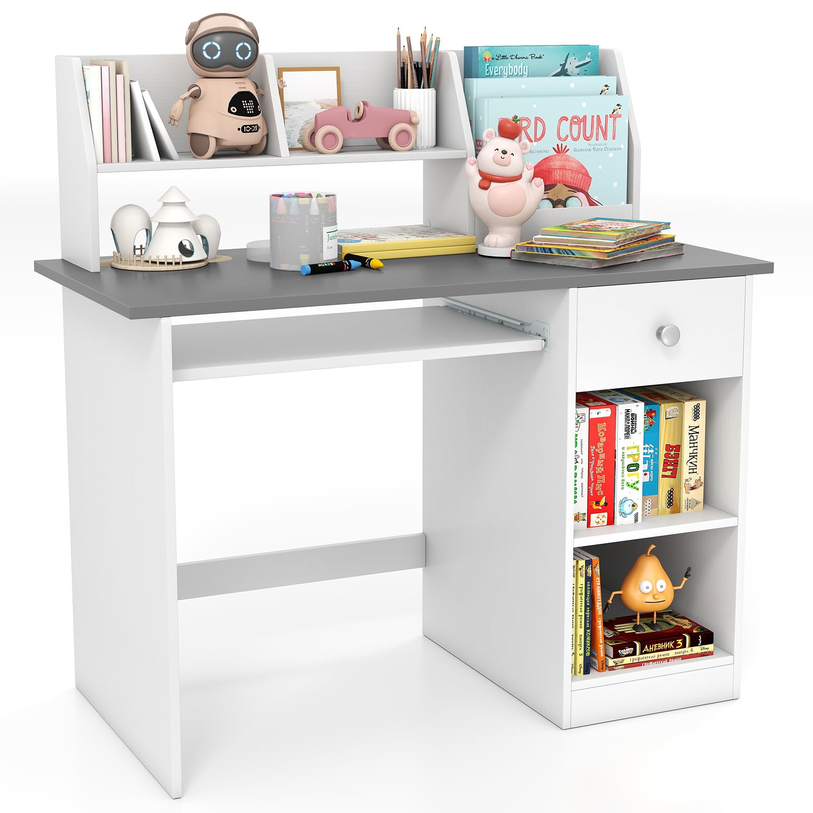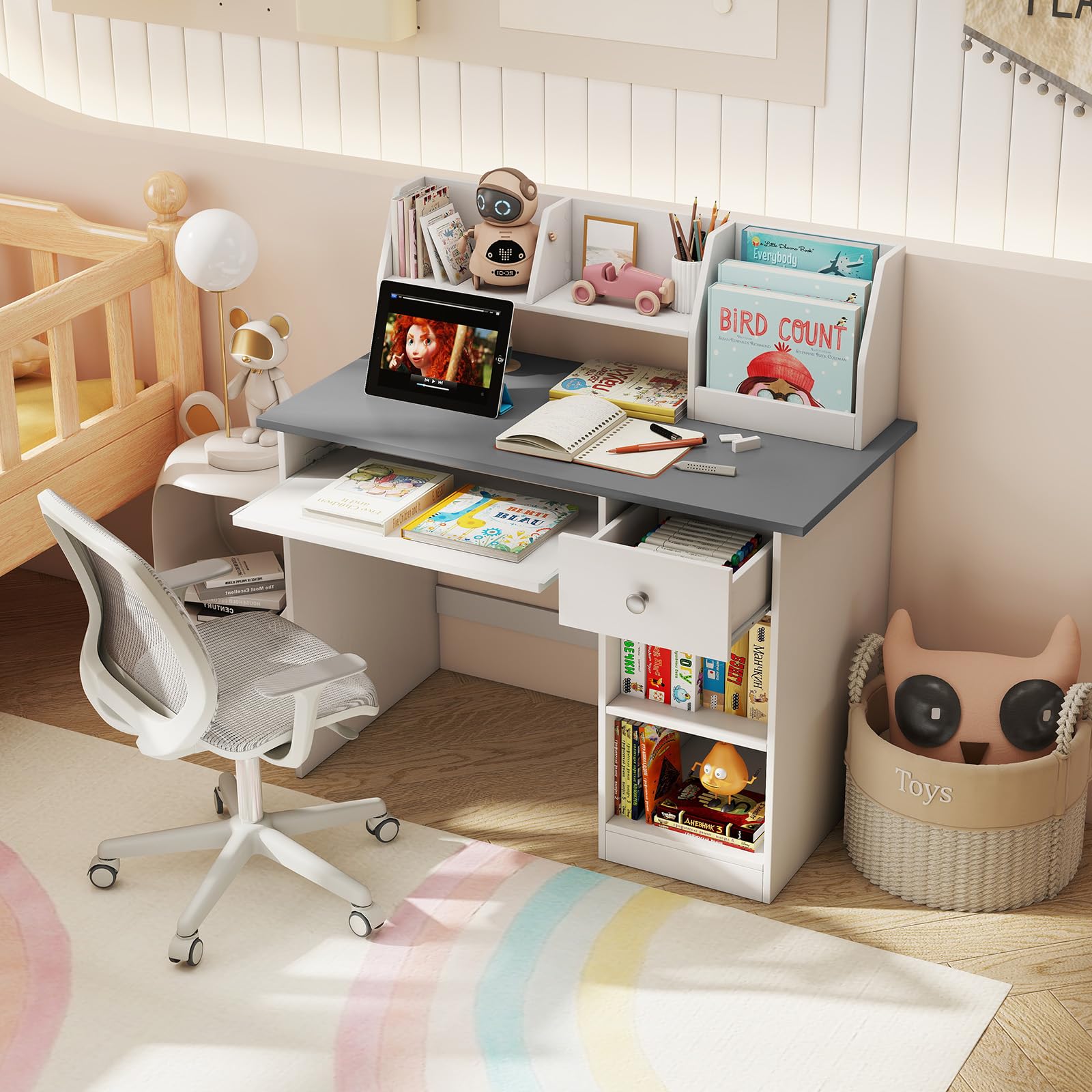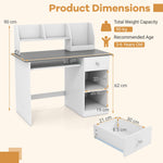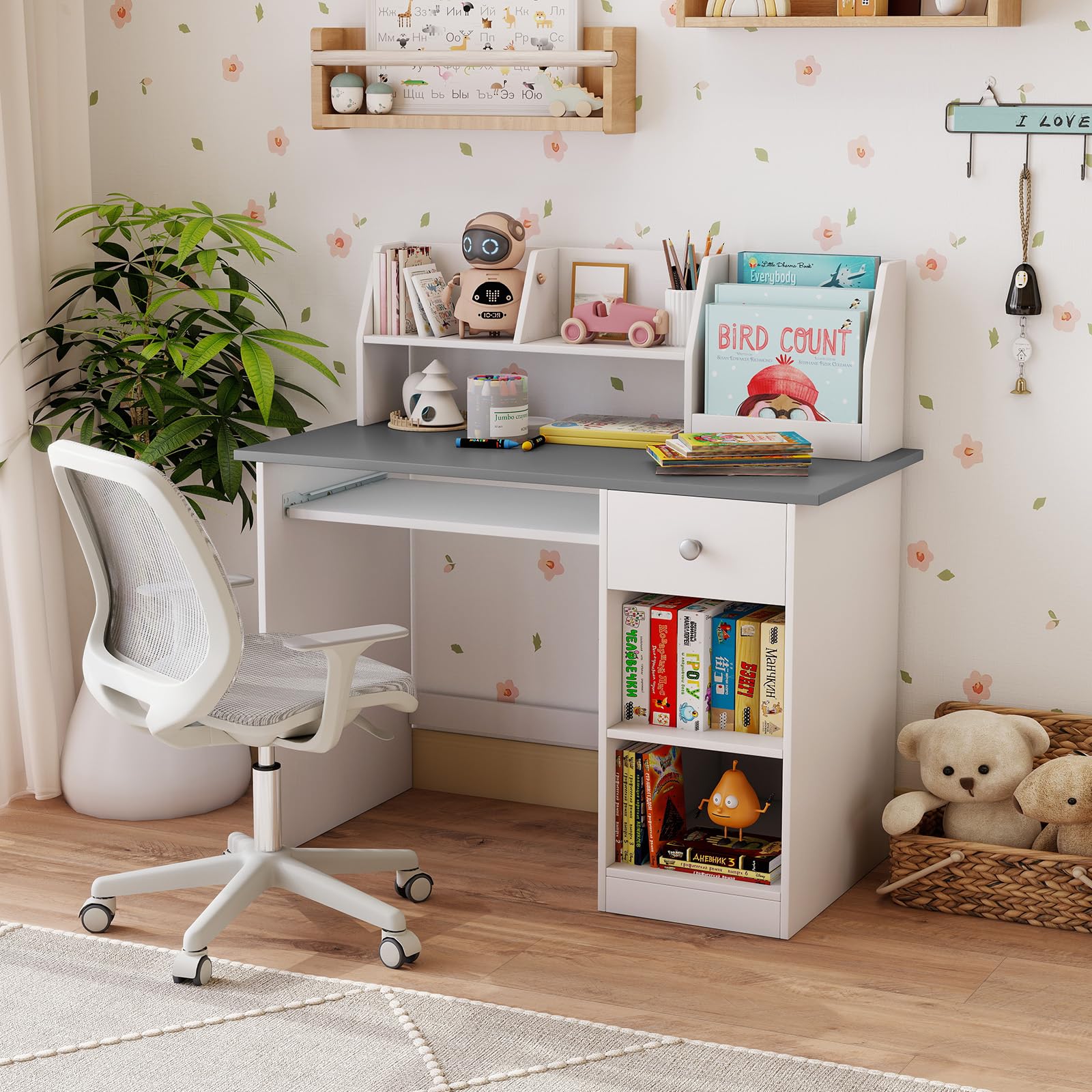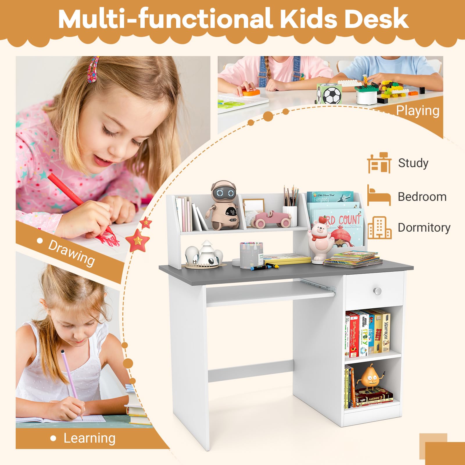 - Sufficient Storage Space: With a large tabletop, bookshelf, drawer and open shelves, the kids learning table and stool set provides ample storage spaces for kids’ daily items. What's more, the thoughtful keyboard tray offer extra space to keep the keyboard within easy reach, ensuring a clutter-free space.