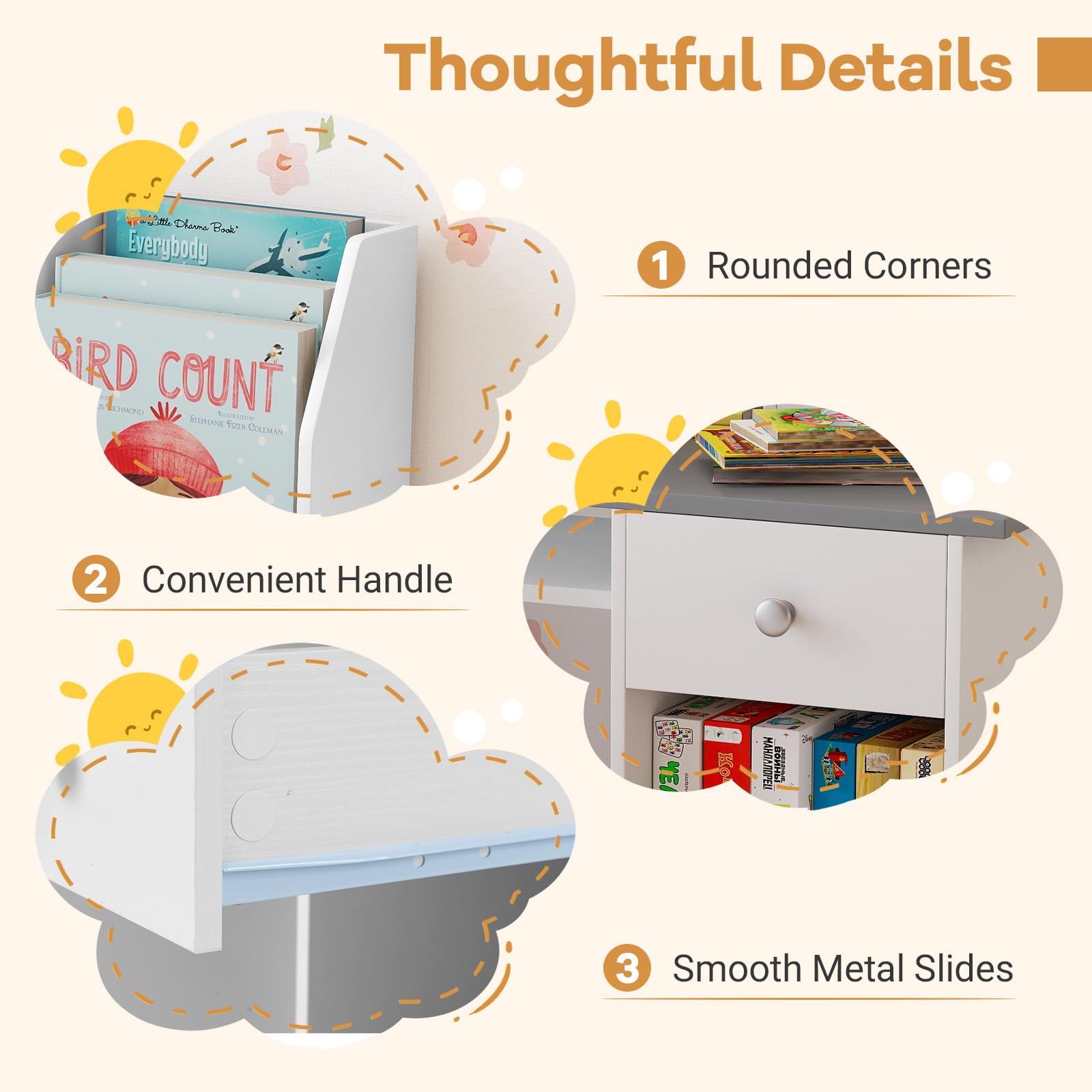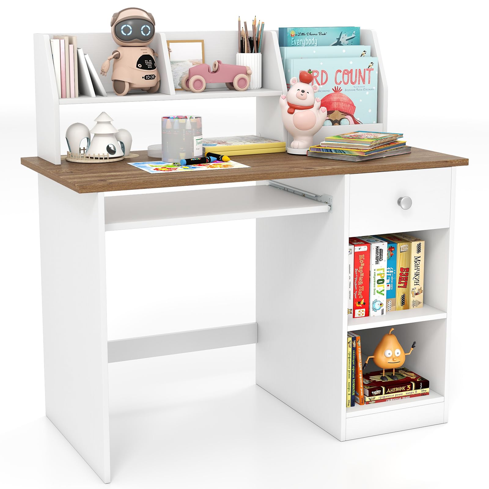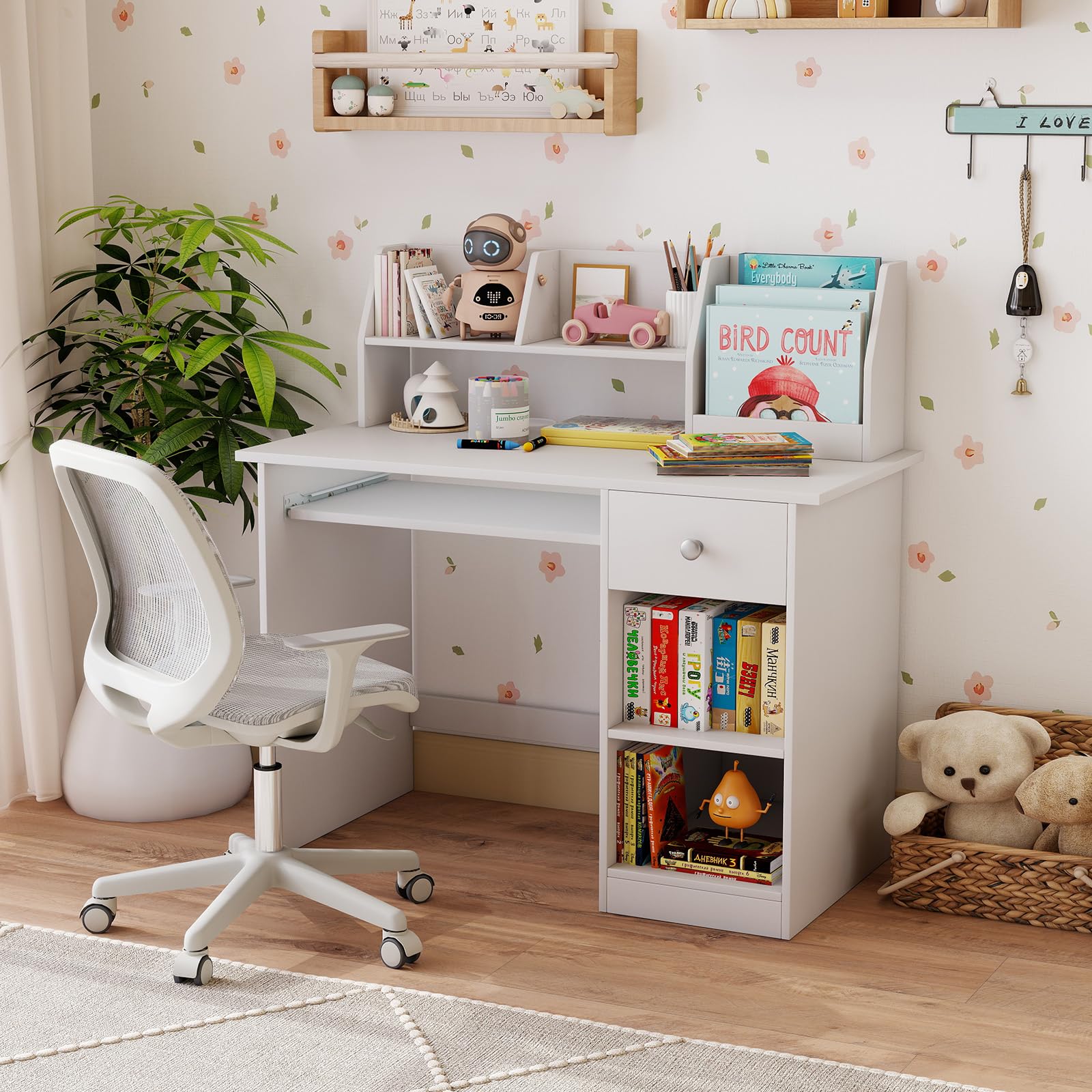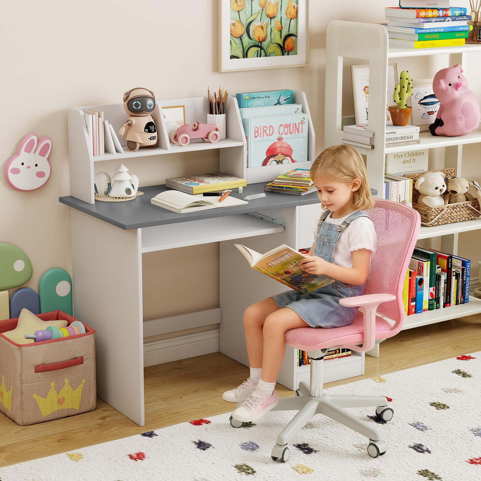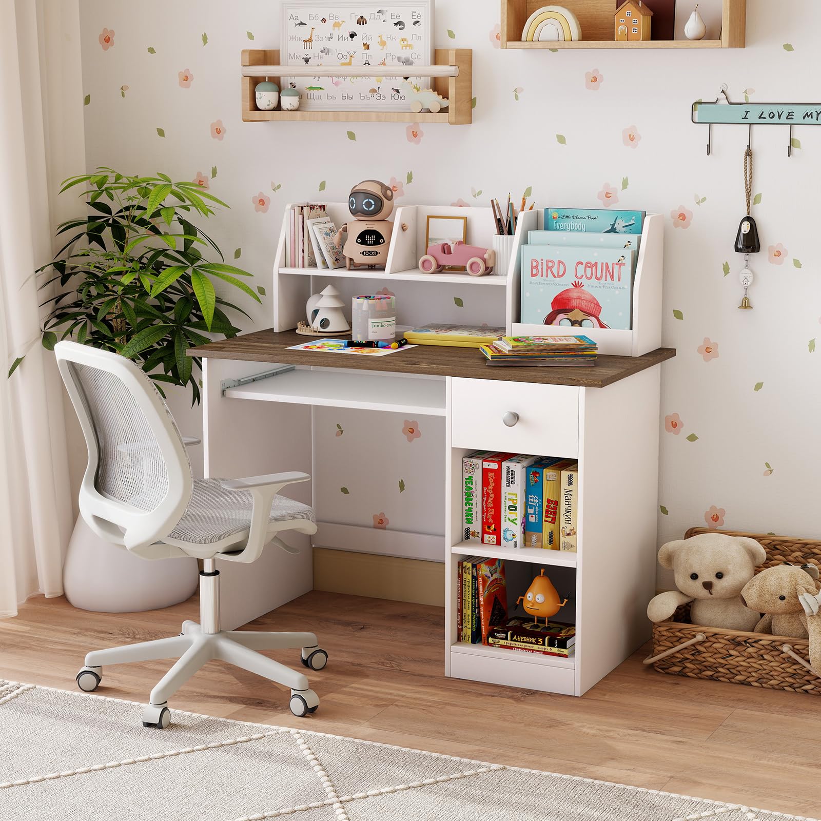- Sufficient Storage Space: With a large tabletop, bookshelf, drawer and open shelves, the kids learning table and stool set provides ample storage spaces for kids’ daily items. What's more, the thoughtful keyboard tray offer extra space to keep the keyboard within easy reach, ensuring a clutter-free space.
