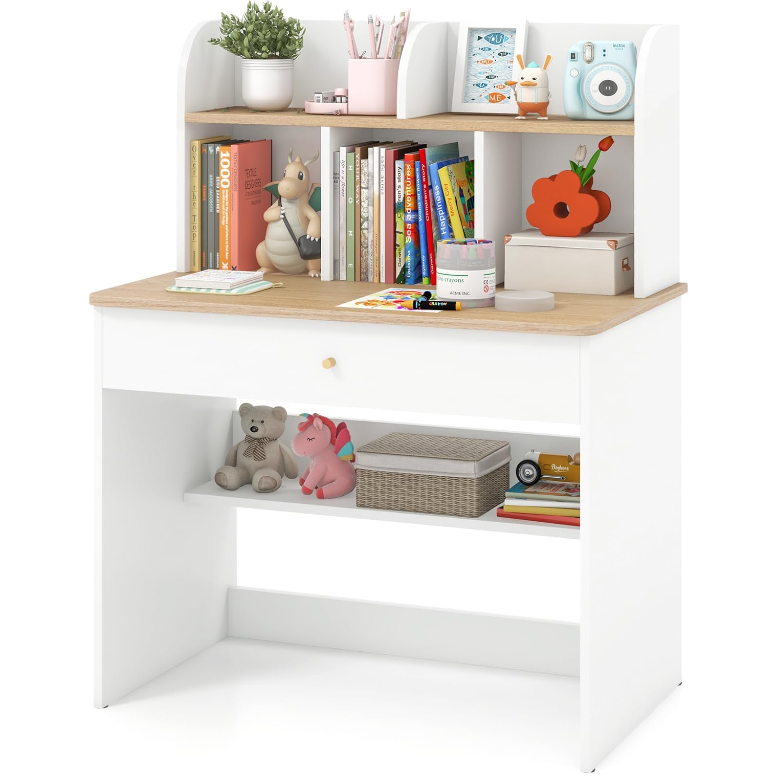- ✔CLASSIFIED STORAGE SPACE- Featuring a large drawer, a hutch with 5 open compartments, and a lower open shelf with a baffle, this kids' study desk offers abundant storage space to keep books, stationery, and other study essentials neatly organized. Additionally, the diverse storage areas help children develop good organizational ability.