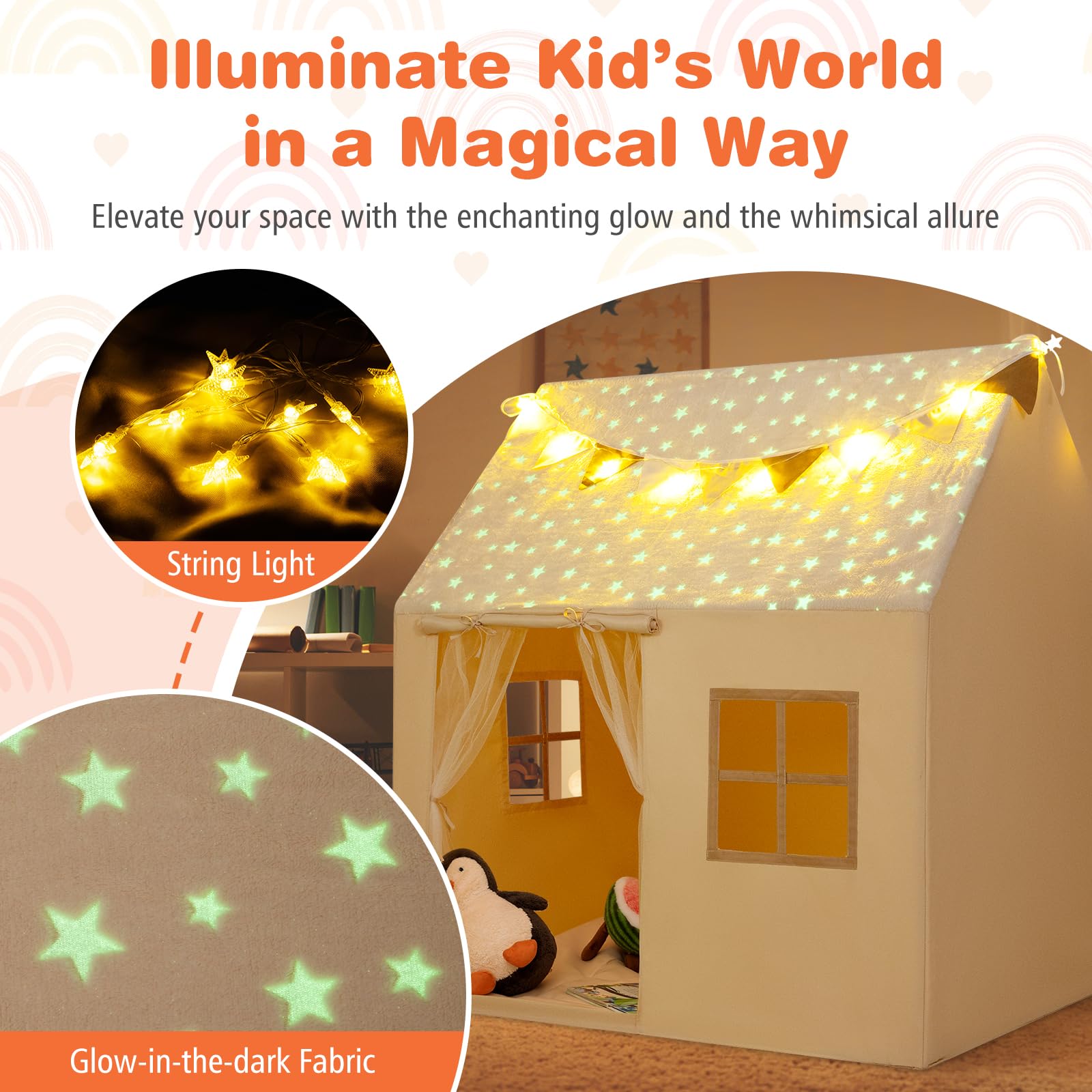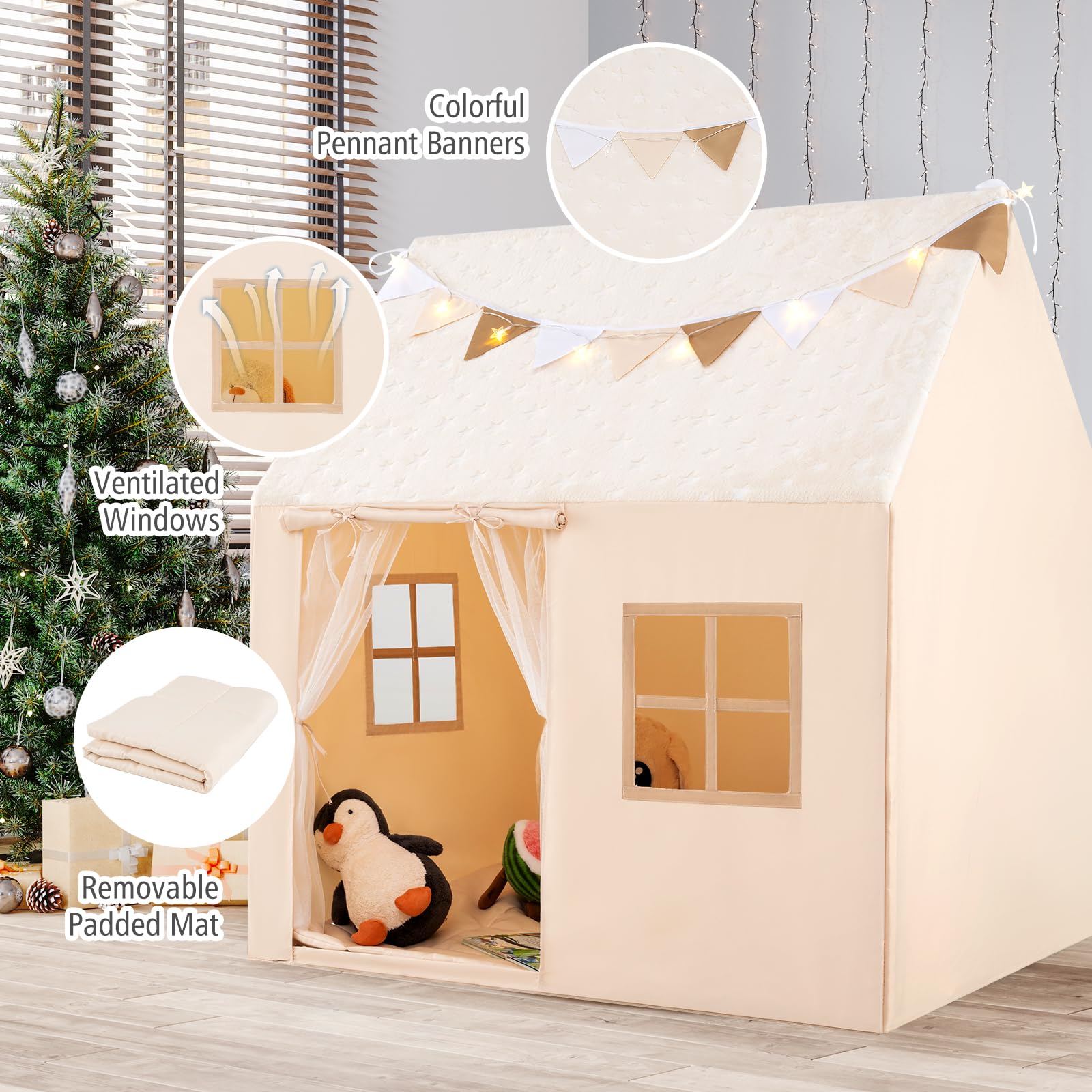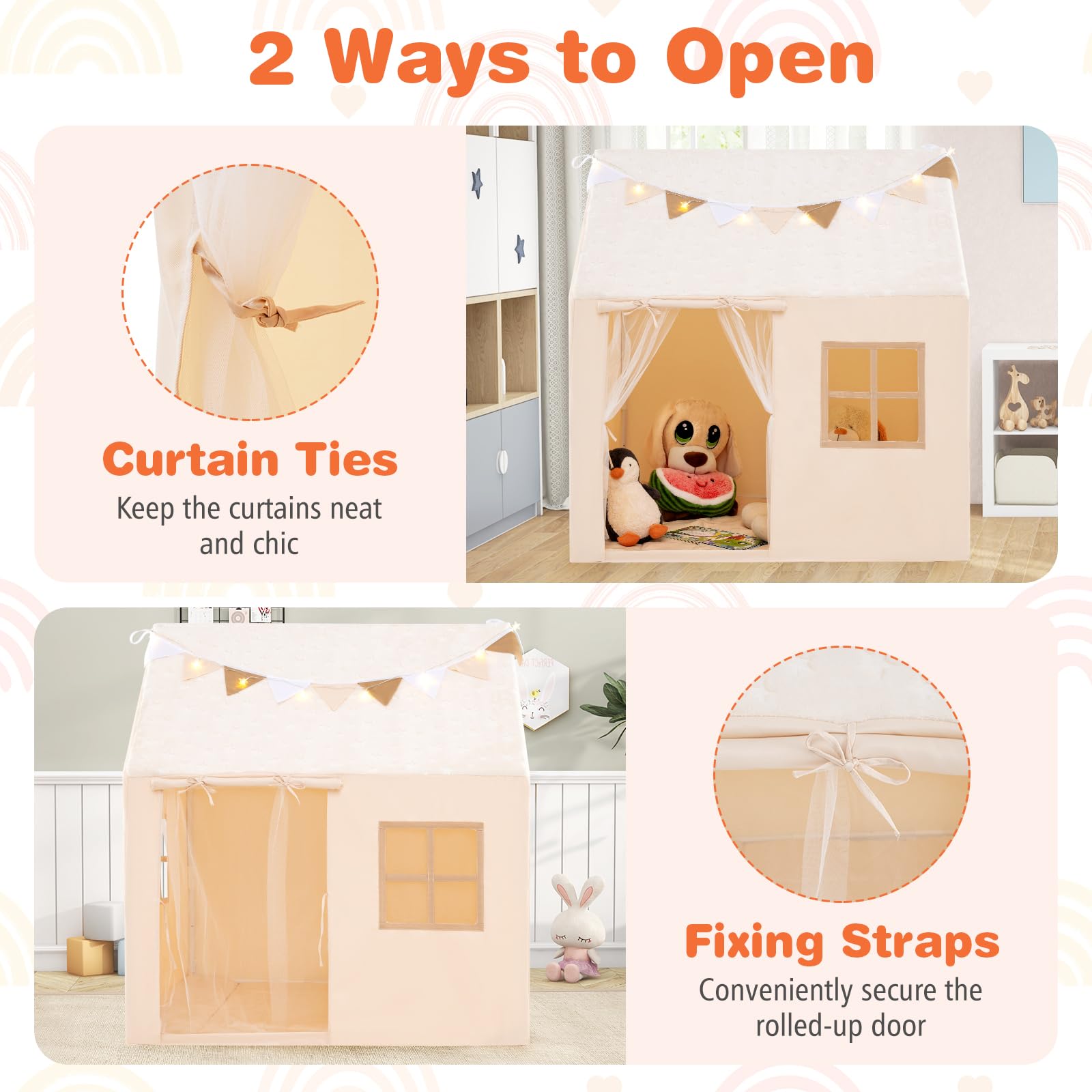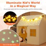 Provide enriching playing experience for kids with the indoor play tent. With glow-in-the-dark stars adorning the ceiling, the toddler play tent transforms any room into a dreamy world that will captivate your child's imagination. More than that, a light string and colorful flags are provided to adorn the children canopy tent. The roll-up door with mesh curtain can be opened for enhanced ventilation and closed for privacy protection, ensuring a well-ventilated space for your little ones. The included padded mat is made of soft polyester peach skin faille, offering a luxurious and cozy touch. Moreover, the flat threshold design eliminates the risk of stumbling for your little adventurers.