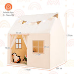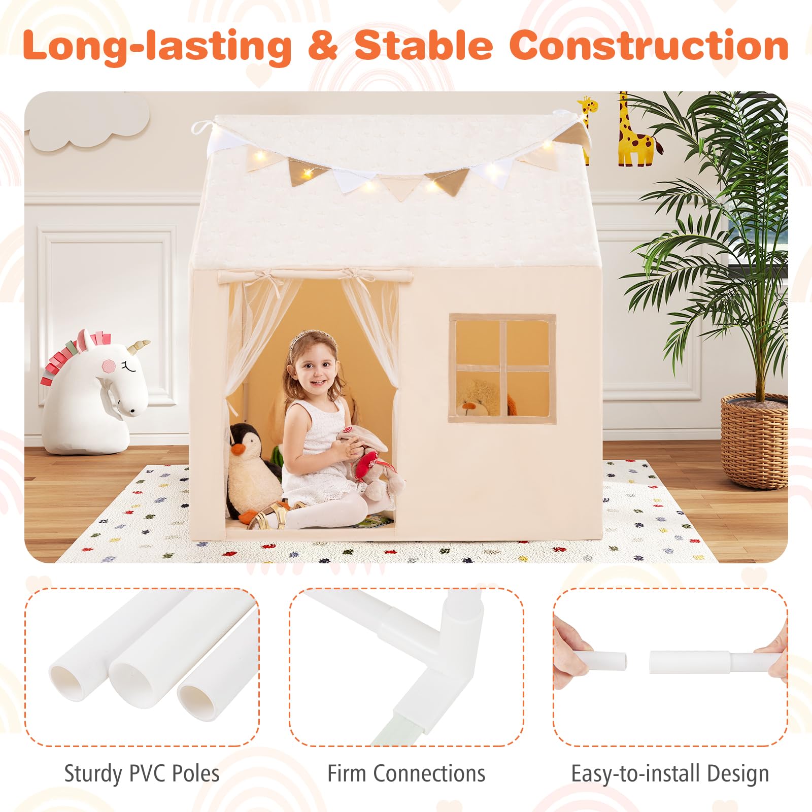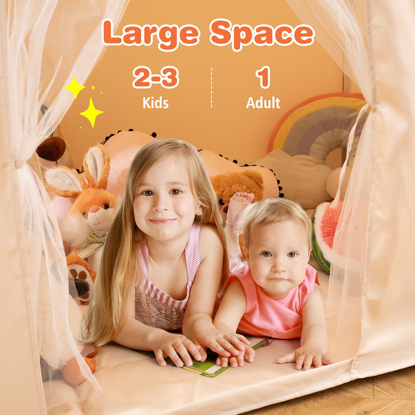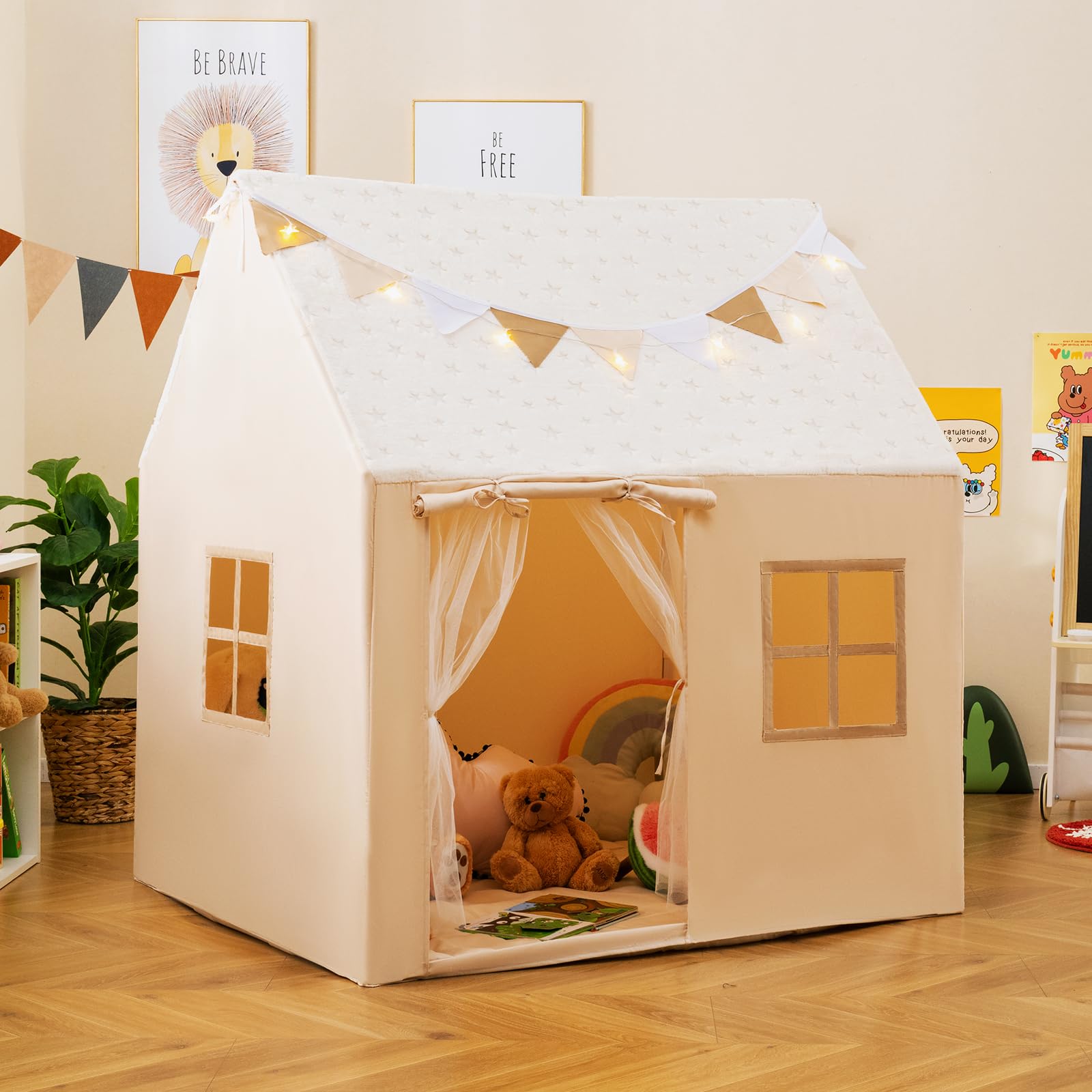 Provide enriching playing experience for kids with the indoor play tent. With glow-in-the-dark stars adorning the ceiling, the toddler play tent transforms any room into a dreamy world that will captivate your child's imagination. More than that, a light string and colorful flags are provided to adorn the children canopy tent. The roll-up door with mesh curtain can be opened for enhanced ventilation and closed for privacy protection, ensuring a well-ventilated space for your little ones. The included padded mat is made of soft polyester peach skin faille, offering a luxurious and cozy touch. Moreover, the flat threshold design eliminates the risk of stumbling for your little adventurers.