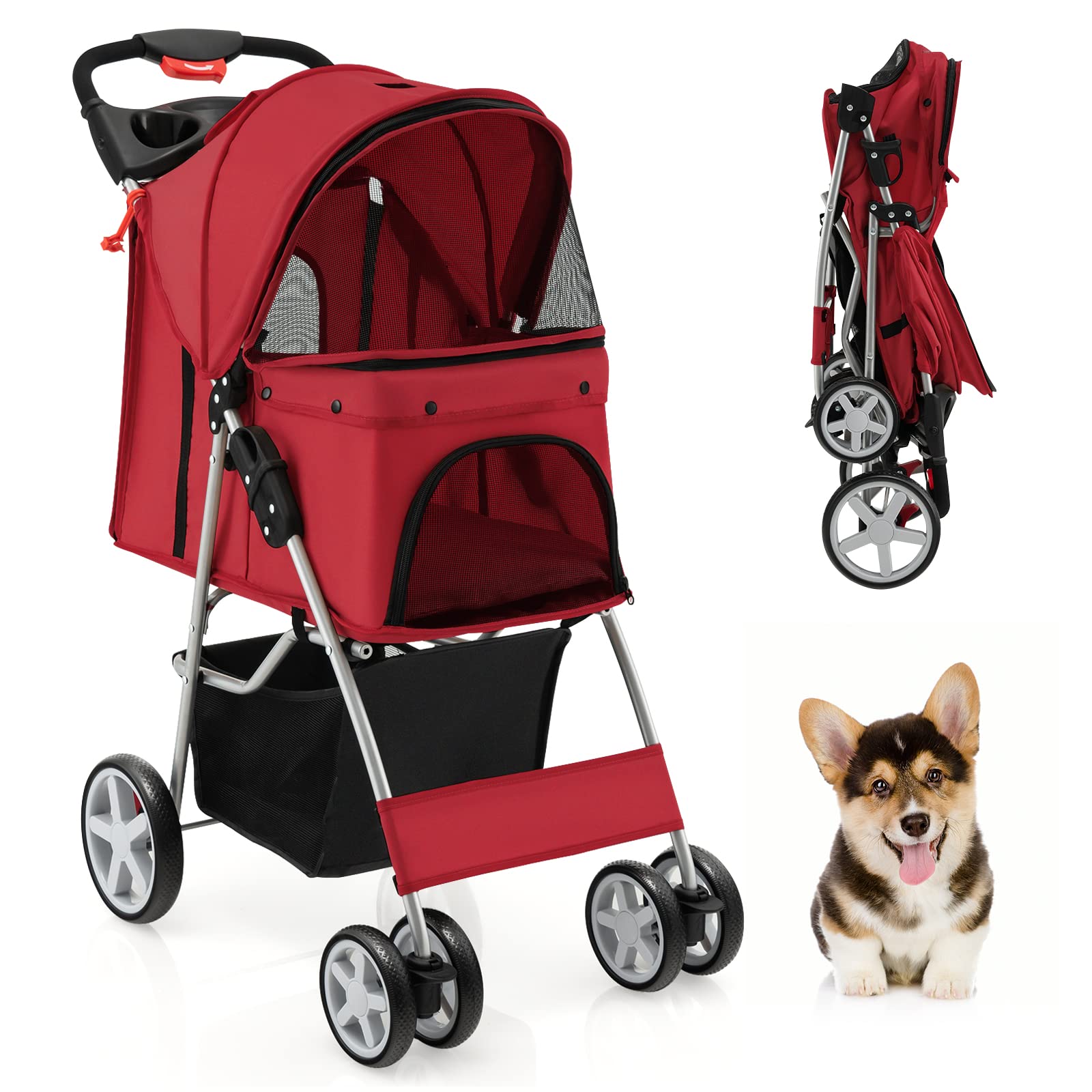 GYMAX Folding Pet Stroller, Portable Pet Travel Pushchair with 4 Wheels, Safety Belt