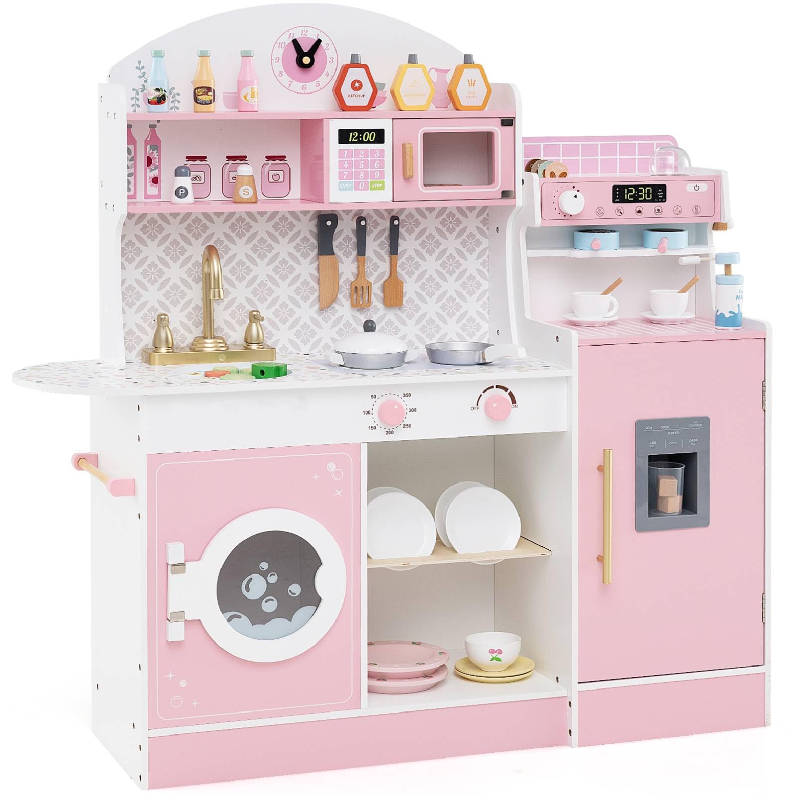 • This complete pretend kitchen includes realistic appliances such as a coffee maker, microwave, ice maker, and washing machine.