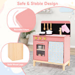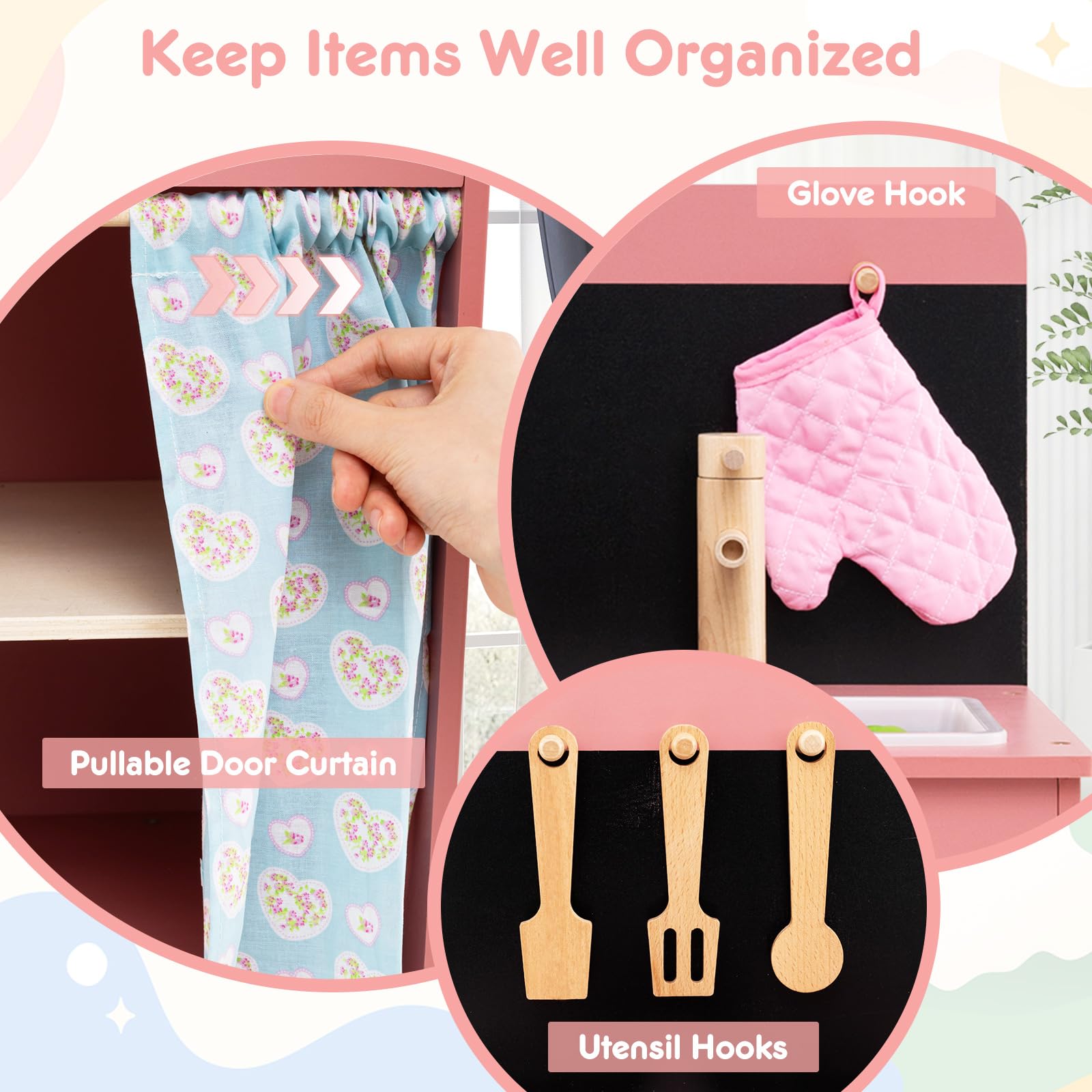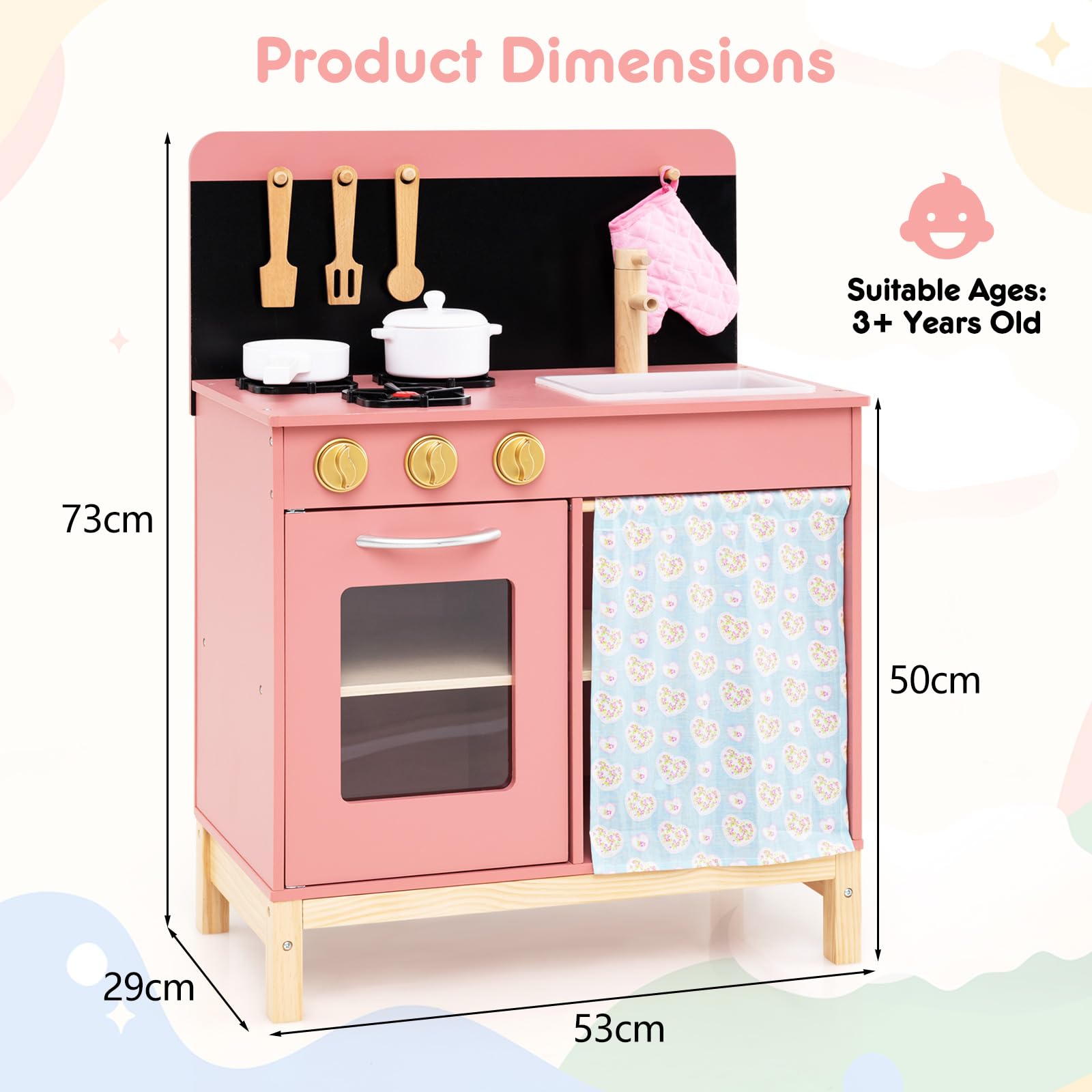 Spark creativity and encourage imaginative play with this kids play kitchen! This Montessori-inspired kitchen playset is a dream come true for little chefs, offering a realistic cooking experience and endless imaginative possibilities. Complete with stoves, sink, and oven, this wooden pretend kitchen toy provides hours of fun for kids. The cookware accessories add to the authenticity of experience while the storage cabinet, glove and utensils hooks keep their play area tidy and organized. Safety is a priority with rounded corners and smooth surface. Watch as they delight in this toy kitchen set, which promises to be a favorite activity for years to come.