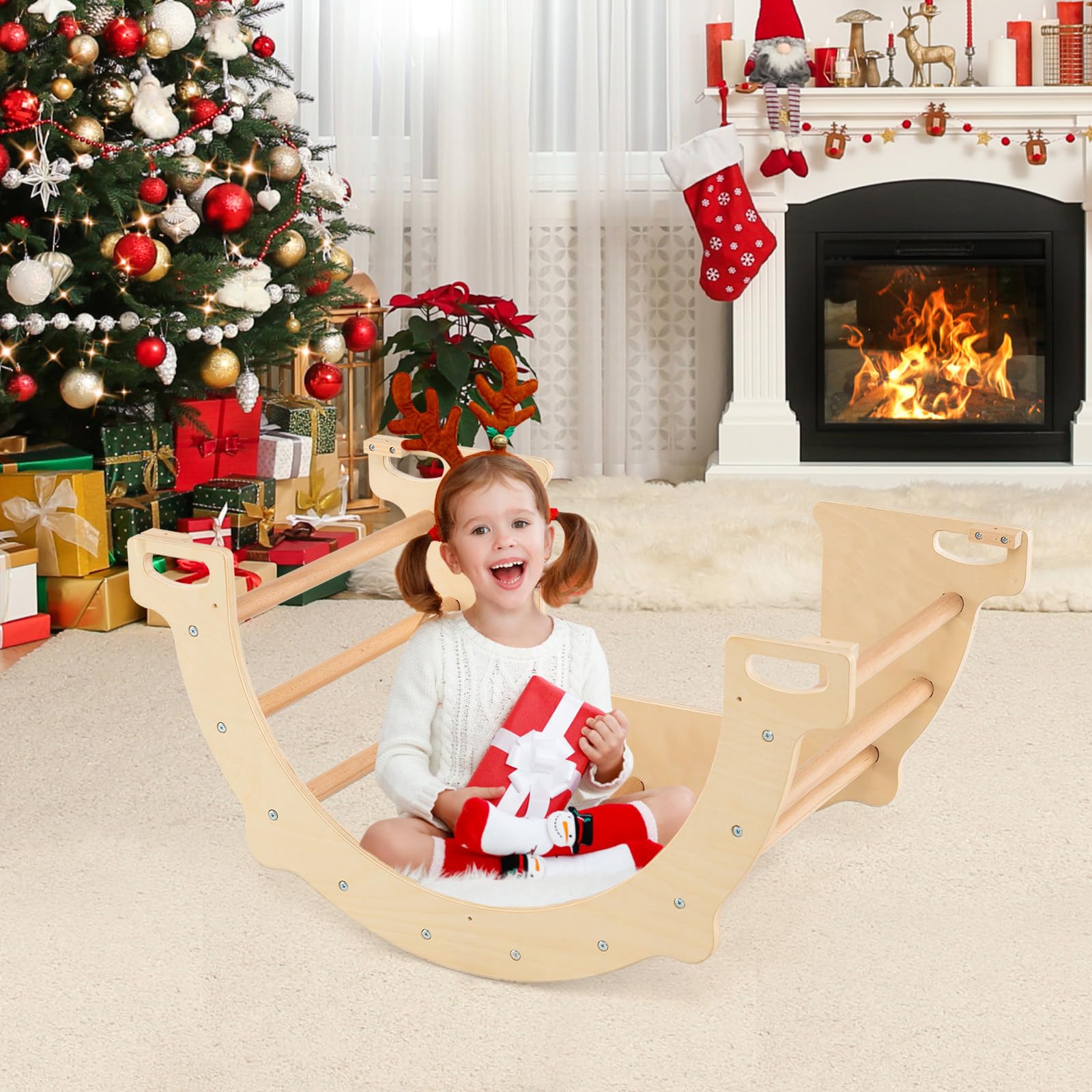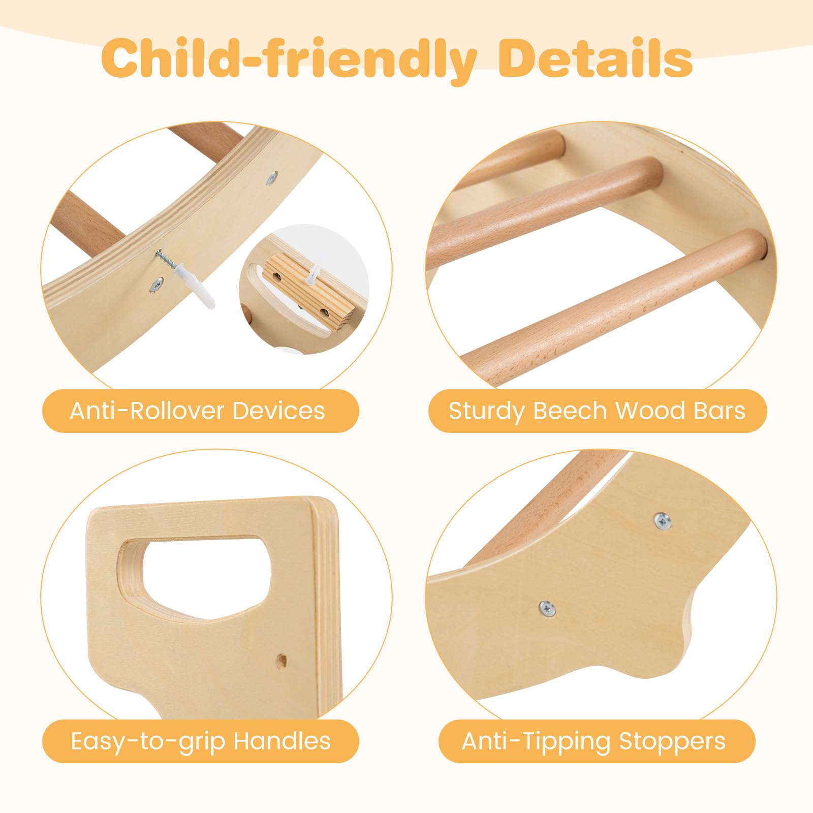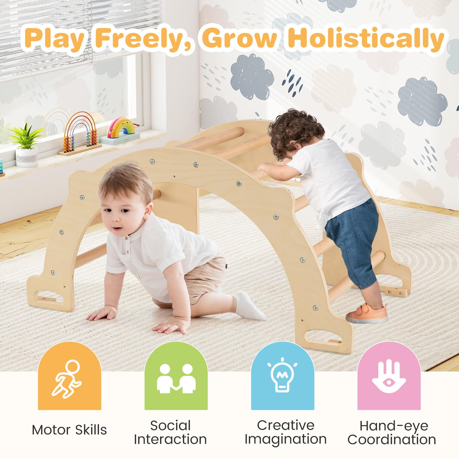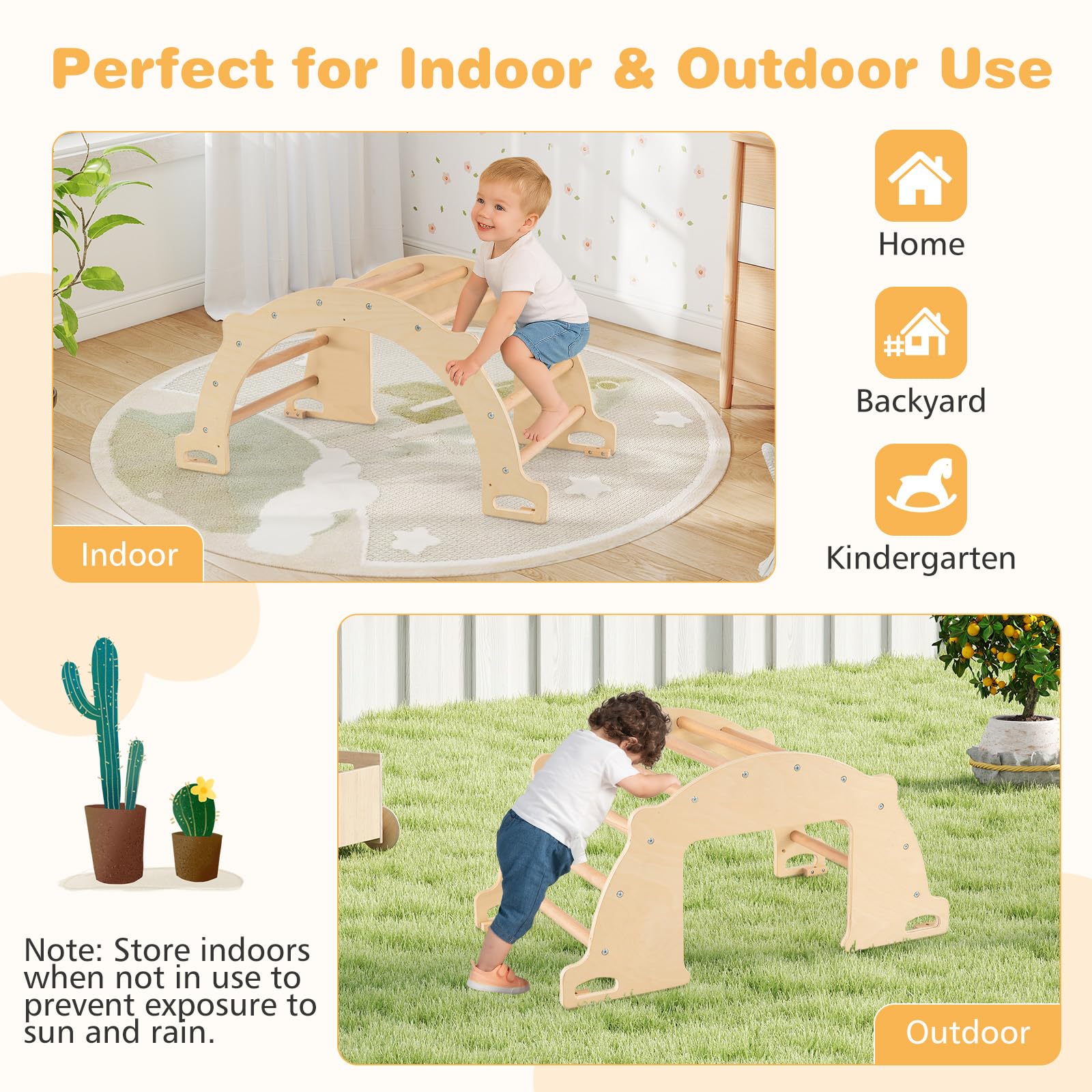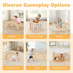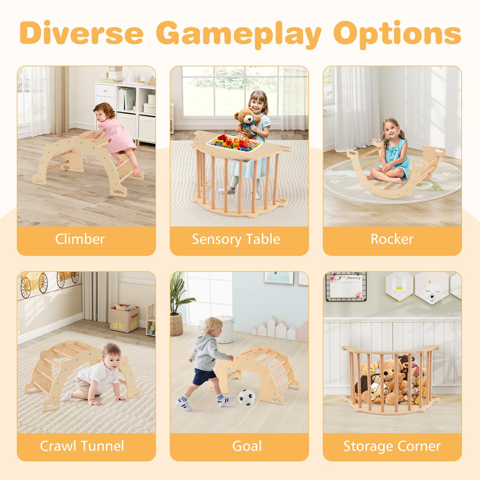 Discover endless fun with our versatile climbing arch! This all-in-one playset offers a climber, sensory table, rocker, crawl tunnel, goal area, and storage corner for diverse gameplay options. Featuring a removable and foldable storage bin, this wooden sensory table allows kids to play with sand/water or store toys and essentials after playtime, keeping the area clean and tidy. With child safety in mind, our climber is built with sturdy beech wood bars, anti-tipping stoppers and anti-rollover devices for a secure play environment. Unlock a world of possibilities and watch your child grow and thrive with our Montessori climbing gym - the ultimate playset for endless hours of fun and holistic development!