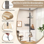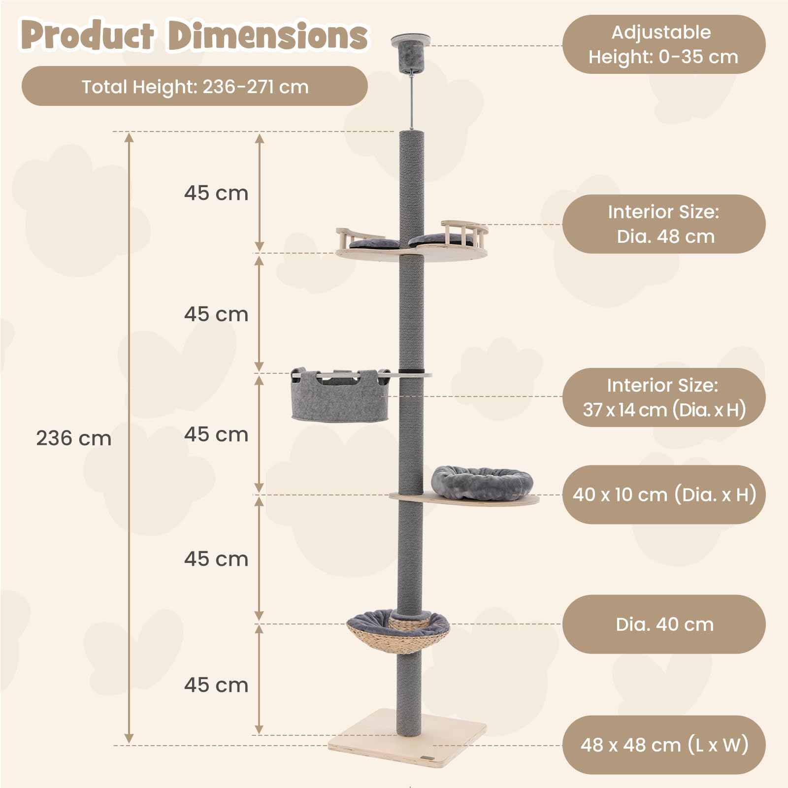The floor-to-ceiling cat tree measures 48 x 48 x 236-271 cm (L x W x H) and comes with 5 tiers, providing spacious activity spaces for cats to explore, scratch, play, and relax. The height can be adjusted from 236-271 cm to fit different ceiling heights. And thanks to its compact size, this cat tree occupies minimal floor space while providing maximum vertical space. Built with durability in mind, our cat tower adopts a plywood frame and a thickened supporting post, ensuring a solid foundation for your cat to explore and play on. More than that, this multifunctional cat tree includes a fence springboard for interactive play, a comfy hammock for lounging, a round basket bed for cozy naps, and a soft cat bed for ultimate relaxation, providing various relaxation options. And the long vertical scratching post provides a satisfying scratching surface that helps keep your cats' claws healthy. Additionally, there are 3 soft plush cushions, providing lasting comfort and support for your beloved pets. This floor-to-ceiling cat tower would make your kitten’s day full of excitement!
