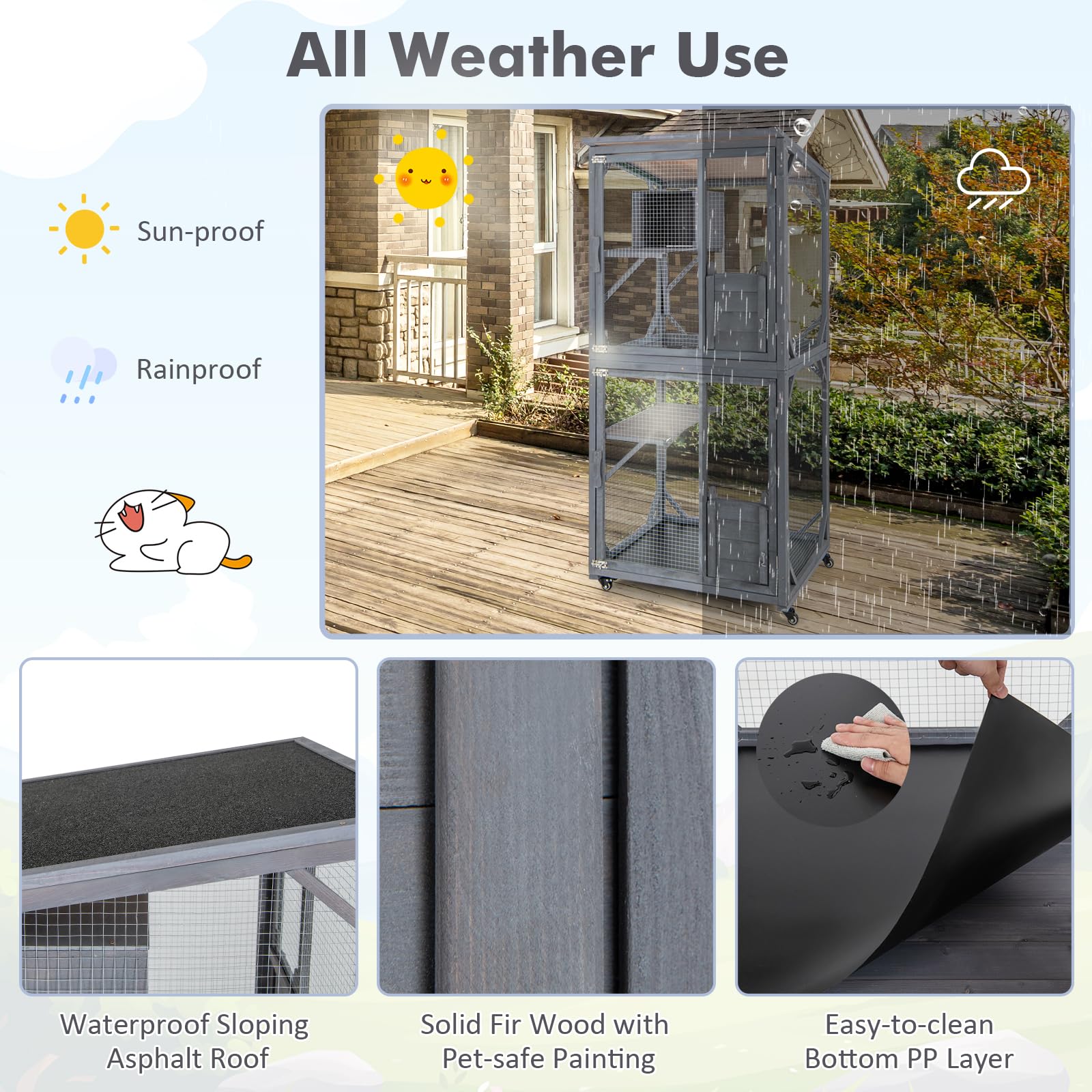 - ✔SELECTED MATERIAL & ALL WEATHER USE- Made of solid fir wood with pet-safe painting and supported by strong triangle brackets, the cat enclosure ensures high sturdiness and security. Moreover, with a waterproof and sun-proof sloping asphalt roof, the cat cage can protect your cats from any bad weather.